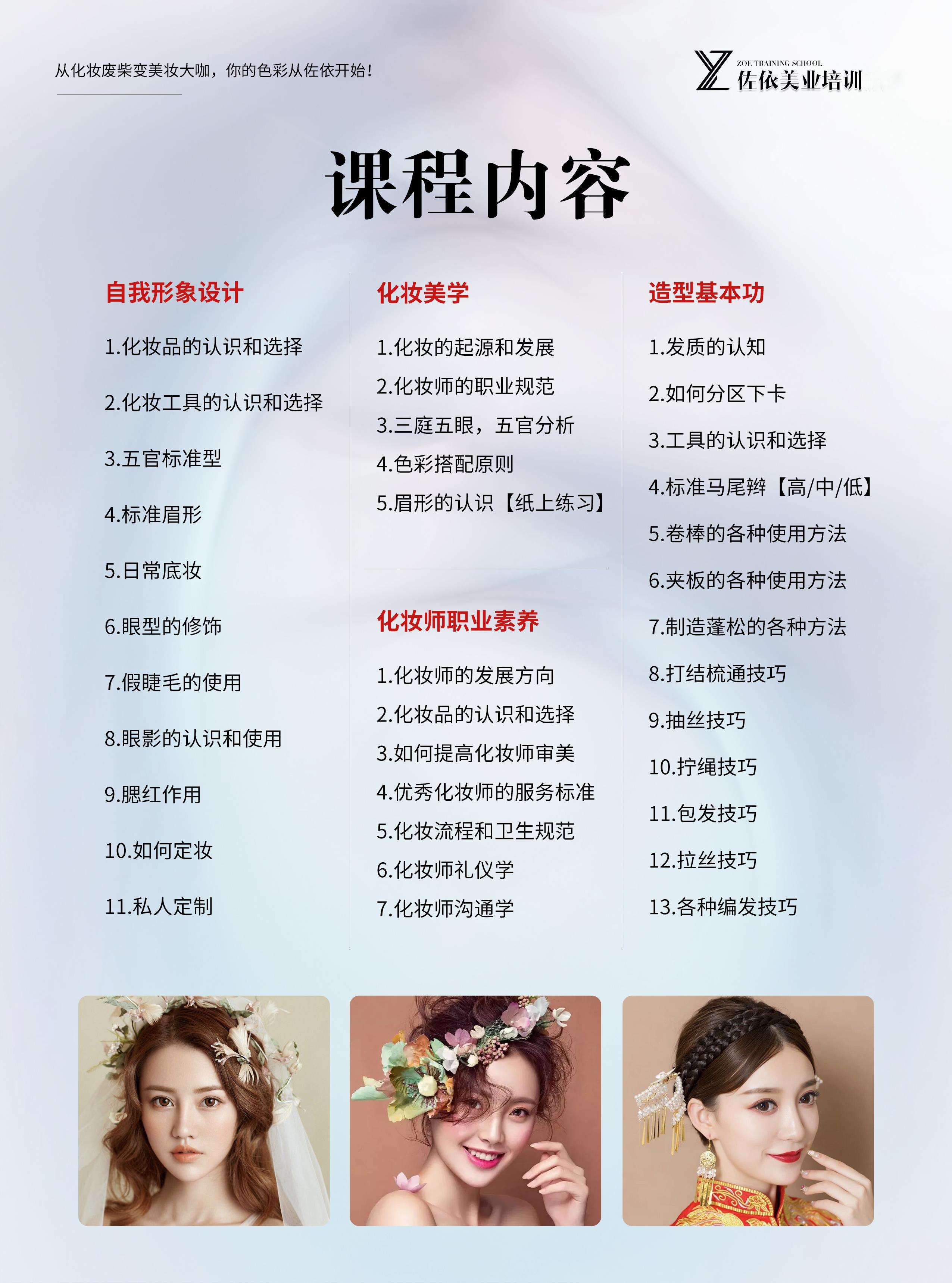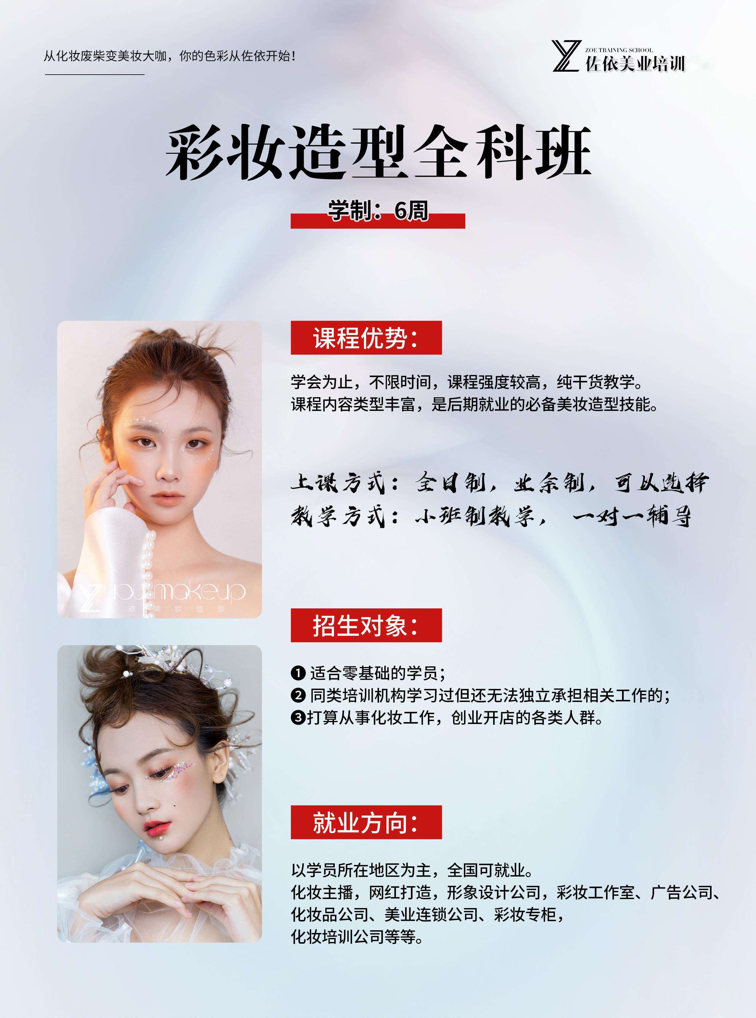 机构简介:佐依美业培训,省内直营连锁校区,总校创办于2012年,是一家专注于美容美体、化妆造型、美甲美睫、半永久纹绣、皮肤管理、摄影的技能培训。师资拥有10多名专业任课教师,教龄均在5年以上,完善的教学体系,理论+实操相结合,培养了一批又一批的美容师、美甲师、化妆师、纹绣师,学生遍布全国各地,也为行业输送了大量美业人才。承诺:1、小班化教学:一对一辅导,保证教学质量;2、包教学会:完成课时课程,如未考核通过或者自己觉得没学好,可以免费复学,直到学会为止;3、推荐就业:学员通过考核,将推荐安排就业,提供多个商家供学生选择,直到双方满意为止;4、免费进修:凡是毕业学生,凭毕业证后期10年内免费进修;5、消费透明:一次性收费,中途绝无二次隐形消费6、协助开店:毕业学生如需创业,学免费提供创业咨询,老师下店辅导