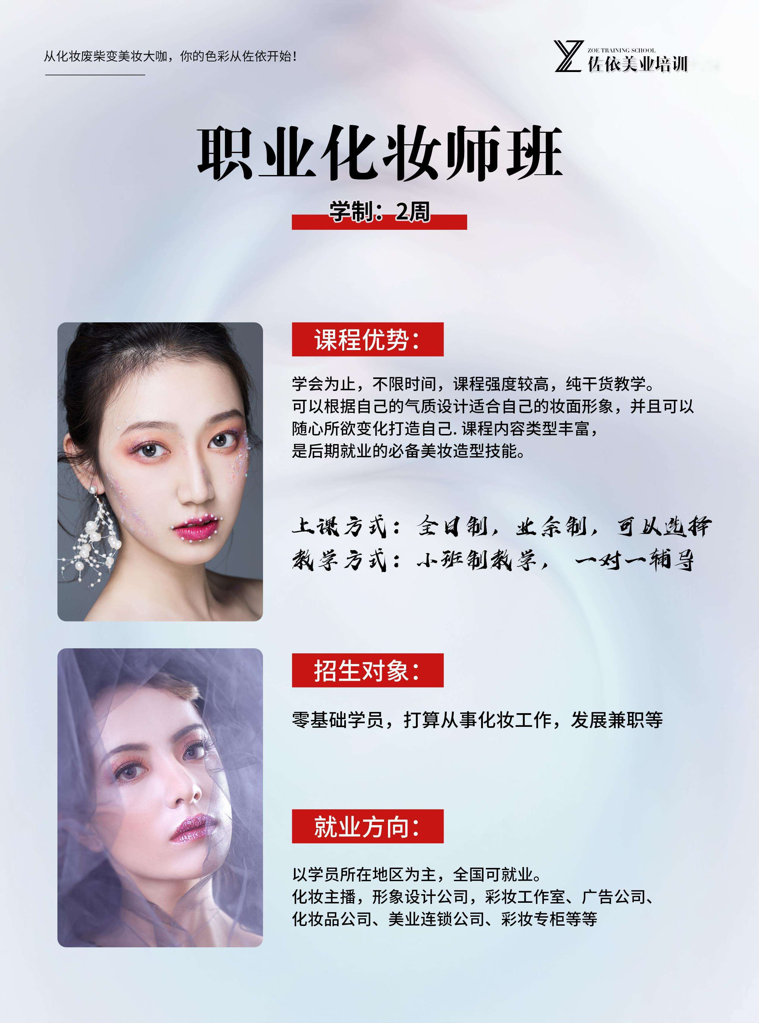 机构简介:佐依美业培训,省内直营连锁校区,总校创办于2012年,是一家专注于美容美体、化妆造型、美甲美睫、半永久纹绣、皮肤管理、摄影的技能培训。师资拥有10多名专业任课教师,教龄均在5年以上,完善的教学体系,理论+实操相结合,培养了一批又一批的美容师、美甲师、化妆师、纹绣师,学生遍布全国各地,也为行业输送了大量美业人才。承诺:1、小班化教学:一对一辅导,保证教学质量;2、包教学会:完成课时课程,如未考核通过或者自己觉得没学好,可以免费复学,直到学会为止;3、推荐就业:学员通过考核,将推荐安排就业,提供多个商家供学生选择,直到双方满意为止;4、免费进修:凡是毕业学生,凭毕业证后期10年内免费进修;5、消费透明:一次性收费,中途绝无二次隐形消费6、协助开店:毕业学生如需创业,学免费提供创业咨询,老师下店辅导