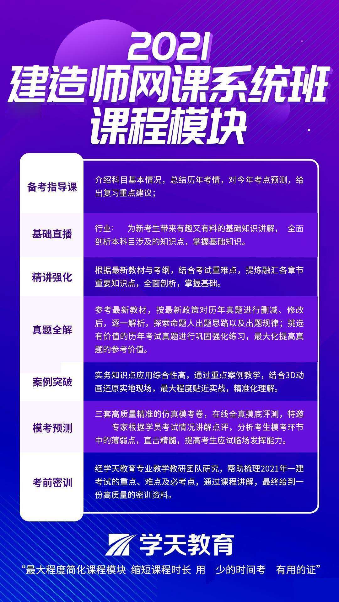 机构简介:学天教育让人人享有优质教育学天教育,2010年创办于杭州,已发展为一家集培训教学、教育产品研发、职业技能培训于一体的多领域综合性专业教育平台企业。目前已在北京、上海、广州、深圳、西安、南京、合肥、郑州、沈阳、济南等全国重点城市开设了70余家分校,每年服务学员数十万名,累计服务学员近百万;服务各类行业企业数万家,是行业专业人才储备基地之一。学天教育自创建以来,凭借着专业、值得信赖的教培服务,获得了行业的认可,成为中国建设教育协会会员单位。学天教育成立之初就专注于产品质量的提升和技术应用的创新,在教学内容研发和在线教育科技两方面不断加大投入,打造核心竞争优势,确保教学效果。作为一家在线教育企业,学天践行“以科技推动教育”,拥抱主流互联网技术打造学习的“中台能力”,以海量学习数据作为支撑,不断引入人工智能、3d、AR、VR等技术,从而优化教学效果、提升学习效率,逐步迈向千人千面自适应学习、最终实现因材施教。经过多年行业深耕,学天教育积极打造产业协同,目前已经在建工、消安、医卫健康、财经、教资等领域形成完整产品线。同时,根据公司战略规划也将特定领域的职业实操技能培训、管理培训、企业资质升级等板块纳入战略发展新版图,学天将一直致力于打造普惠、便捷、高质量的优质教育平台。学天教育未来将继续秉承“诚信正直、担当责任、激情卓越、团队合作、拥抱变化”的企业价值观,让更多人通过学习把知识转化为价值,从而提升个人价值、社会价值;学天教育将继续致力于不断向全社会提供优质教育资源,为促进教育公平而不断努力!学天教育十大优势多年专业品牌多年深耕建工领域,60余家分公司布局,建工社等多家权威机构合作伙伴健全产品体系产品涵盖建造、消防、造价、安全、监理等建工领域全项目、医卫类项目、成人学历教育、少儿教育专业化全流程服务千余名学习顾问全程跟踪学习进度;50余名专职客服保障畅学无忧学天网校线上线下相结合的O2O教学模式,课程每周更新;多名专业老师授课;直播、点播随心所欲学天网校APP产品与服务集成于手机APP中,除了点播、直播、离线功能外再加班级群服务学天课堂小程序无需安装、触手可及、用完即走,以用户为设计中心,为学天新老用户提供了一个便捷学习的快捷通道。学天新媒体矩阵以公众号为基础,学天新媒体矩阵建立起来并不断完善,给行业企业、学员提供了一个专业、及时、有深度的免费内容输出平台。人才增值百万级数据库,提供建工行业专业人才与建工企业间的双向人才匹配解决方案企业平台建筑施工企业收购、股权转让、重组与分立、项目对接、人脉资源整合等一站式企业服务公司发展历程2010年,学天教育正式落户杭州,主营建工行业职业资格考试考前培训。2011年,成立两家分校,服务学员突破万人,成立一年营业额突破千万。2012年,全国重点城市建立起13家分校;学天网校成立,在线教育正式上线。2013年,全国重点城市建立起30余家分校,年销售额破亿元,项目体系更加完善2014年,实现员工规模超千人的标志性转变,企业内训得到认可2015年,学天教育与中国建筑工业出版社等众多行业相关权威单位展开合作;学天智课成立,实现了全部高清大屏高质量课件从录制到上线的全程自产。2016年,学天网校APP成功上线:听课、做题、下载资料、班级群内答疑等多重全新功能获得学员一致认可!2017年,成为中国建筑工业出版社国家重点实验室合作单位;学天教育项目培训体系扩展至医卫、学历、企业资质咨询等版块。2018年,学天教育累计服务建工学员数十万人,累计合作单位数万家,未来学天教育将更加着重于战略规划与发展,在项目事业部扩展、市场深耕、以及在线教育这三个板块稳步迈进!2019年,集团软硬件整体大升级,从人才、产品到服务,我们拥有了更高规格的要求和标准,为打造优质教育平台不断努力.