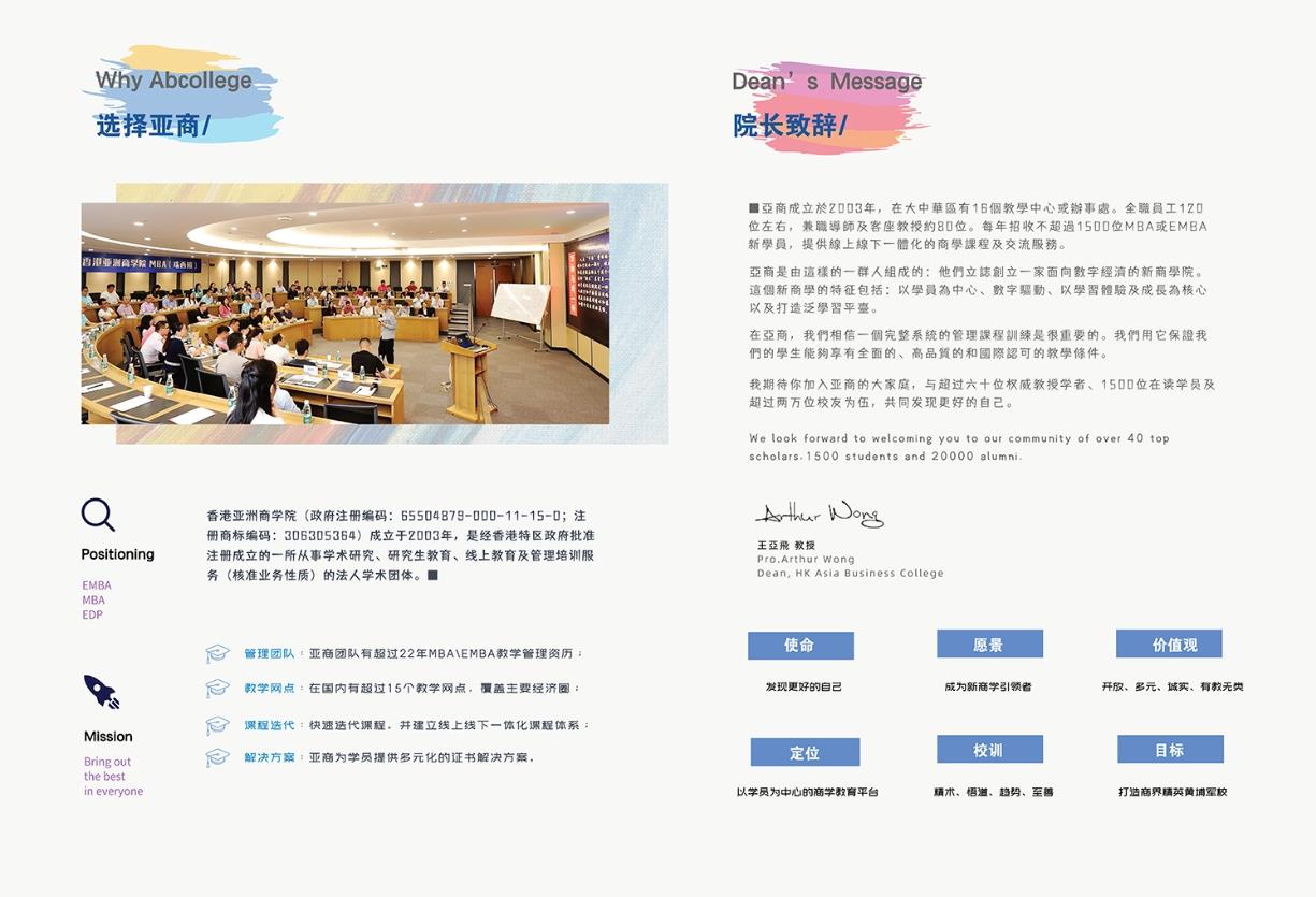 机构简介:香港亚洲商学院(简称亚商)成立于2003年,是经香港特区政府批准注册成立的一所从事高等教育、研究生课程、远端教育、学术交流及管理咨询服务的学术机构。主要科目项目是MBA、EMBA 课程教育、EDP课程、海外合作高校博士项目对接、创业孵化器、青少年素质教育及海内外游学考察等。2005年初进入内地市场,迄今在内地已经运营超过十九年时间。在读及毕业企业家及职业经理人MBA\EMBA学员约一万五千名,共计服务超过两万名学员。亚商使命:让奋斗者发现更好的自己亚商愿景:成为新商学领域的引领者发展目标:打造中国商界精英黄埔军校亚商定位:提供专业MBA、EMBA 课程及交流服务教育理念:精术、悟道、趋势、至善价值观:开放、正直、诚实、有教无类核心四大优势:管理团队 :亚商团队有超过22年MBAIEMBA教学管理资历; 教学网点:在国内有 超过16个教学网点, 覆盖主要经济圈;导师团队:亚商MBA导师团队在国内商学教育领域是卓越的 ;课程迭代:快速迭代课程,并建立线上线下一体化课程体系;解决方案:亚商为学员提供多元化的证书解决方案。经过二十年的积累和沉淀,亚商学院已经培养出了大批优秀的毕业生。他们不仅在各自的领域取得了卓越的成就,更成为了推动社会进步的重要力量。亚商学院的毕业证书及分数单得到了多个国际官方认证机构及海外高校的认可,为学员的职业发展提供了有力的支持。展望未来,亚商学院将继续秉承“以学员为中心”的教育理念,不断探索和创新。学院将紧密关注商业发展的新趋势和新需求,为学员提供更加实用、前沿的商学课程。同时,学院还将加强与国内外知名企业和高校的合作,为学员提供更加广阔的发展空间和机会。如果你渴望在数字经济时代成为一名卓越的商业领袖,那么亚商学院将是你的不二之选。在这里,你将与优秀的教授学者、志同道合的学员和校友共同成长,共同探索商业的无限可能。加入亚商学院的大家庭吧,让我们一起开启新商学之旅,书写更加辉煌的未来!课程设置:《企业战略管理》《财务报表分析》《管理经济学》《战略营销管理》《人力资源管理》《目标与绩效管理》《商业模式管理》《卓越领导力》《组织行为学》《宏观经济与趋势分析》《新媒体时代品牌塑造与营销创新》《创新管理》《人工智能与大数据》《公司治理与股权》《沟通与谈判》《管理心理学》《企业法律与税务》《创业管理》《博弈论》 《产品与产品管理》《宏观经济分析》《管理哲学》《金融学》《新媒体行销》《数字化升级》《资本管理》《压力与情绪管理》《流程管理与优化》《股权与合伙人》《演讲与表达》《九型人格应用》《客户关系管理》《阿米巴经营与京瓷哲学》《斯坦福职场课》《流程管理与优化》《管理沟通》剧本杀 《国学管理智慧》注:每个校区会根据当地市场环境微调,课程时时更新升级迭代。招生对象:总经理、创业者、合伙人、高管、专业人士等企业中高层管理者。报名条件:从事管理职位;具有五年及以上工作经验;具有大专及以上学历。学习时间:学分制,在职学习18个月左右。每个月利用周末上课2-3天;第二课堂另计。 学习证书:学员修完全部课程并考核合格,由香港亚洲商学院颁发工商管理硕士毕业证书。学费标准:MBA面授班:41800元(RMB)。含面授学费、教材讲义、学籍管理、茶点、书包、校服、学生证、校徽及证书等;MBA线上班:25600元(RMB)。含学费、教材、学生证、校徽、校服、书包、学籍管理及证书等。EMBA面授班:51800元(RMB)。含面授学费、教材讲义、学籍管理、茶点、书包、校服、学生证、校徽及证书等;EMBA线上班:29600元(RMB)。含学费、教材、学生证、校徽、校服、书包、学籍管理及证书等。注:每年学费会有所上调,详情请咨询招生老师。报名流程:提交报名表及个人资料→ 入学资格审核→ 发放录取通知书→交纳学费→注册学藉、开始正式学习报名材料:入学申请表、身份证正反面复印件或护照或港澳台身份证、最高学历证明 、2寸彩照片、学费