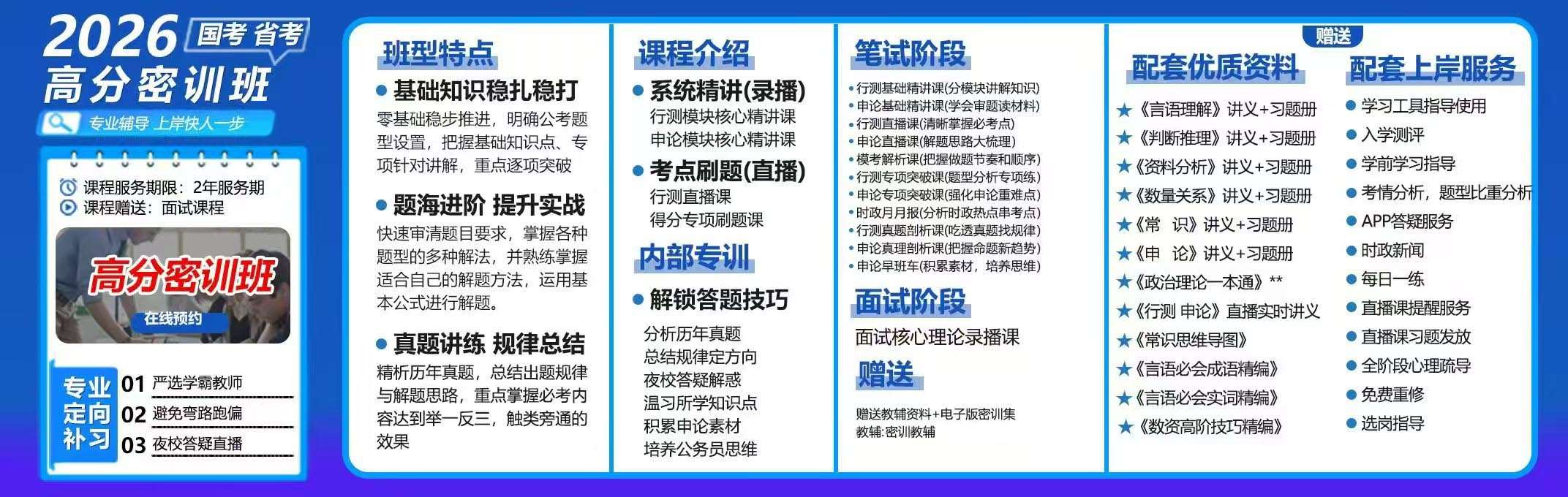 入学测试,三个阶段的个性化学习计划,小班化教学,1v1服务,督学提醒上课,公告讲解,报考指导、选岗指导、笔试,面试,政审指导,体检指导。