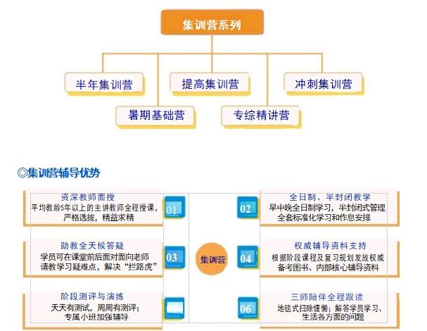 鹰飞集训营产品分为半年营、提高营、冲刺营、暑期基础营,专综精讲营。优质的学习环境、安全舒适的 住宿环境、浓厚的学习氛围、紧凑的学习节奏、并肩作战的学习伙伴,给你满意的备考体验,还你理想的奋斗 结果。