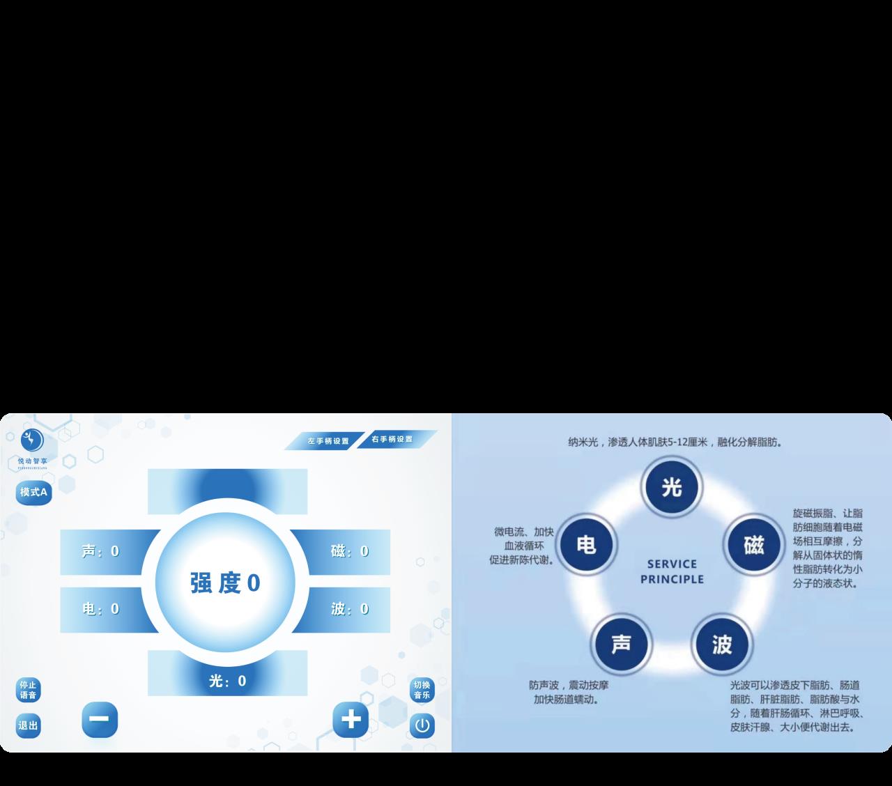 6、(磁)旋磁震脂,让脂肪细胞随着电磁场相互摩擦,分解从固体状脂肪转化成液态脂肪。
