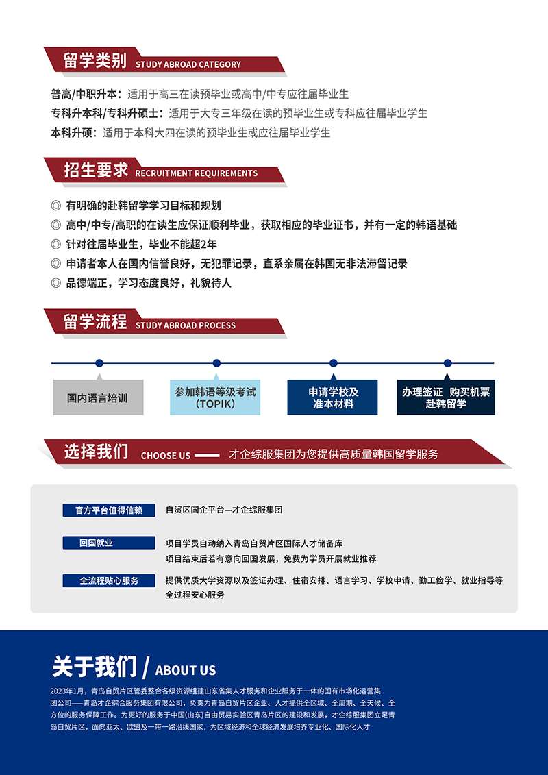 机构简介:青岛才企综合服务集团成立于2023年,实力属于青岛自贸区管委的国有企业,自从2023年就开始专注于职业教育人才培养,在众多高校设立了人才服务驿站。链合德国IHK工商会、HWK手工业行会、日本神户友好城市交流协会等资源,面向大中专、高职院校毕业生、本科毕业生及社会技能人才全面发展开发新赛道,为广大毕业生及技能人才提供全球高质量就业、海外学历提升解决方案。2024年与奥德(ÖSD)欧标德语考试院签署战略协议,在山东科技大学成立奥德欧标德语考试中心,截止到2025年已成功举办3次奥德欧标德语考试。目前青岛才企留学主要产品有:德国双元制技能留学业务、德日韩留学业务。