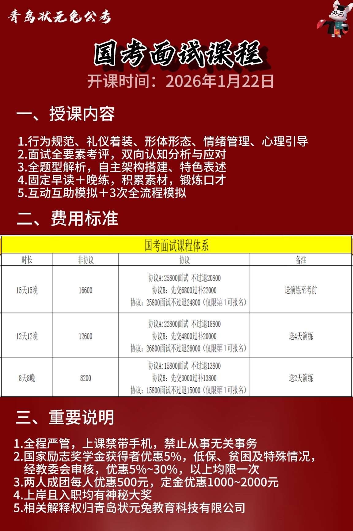 机构简介:状元兔公考为状元兔教育集团旗下公务员培训辅导专业机构,历经十多载求索与沉淀,在公务员,事业编,选调生,优才遴选,三支一扶,军队文职,直招军官,军转安置,央国企等笔,面试培训领域硕果逐丰,已布局江苏省为中心覆盖全国近70家分校。荣获CCTV广告签约单位,2025年10月31日人民网专题报道,2025年9月8日新华网专访,腾讯新闻教育频道"回响2024年度公考口碑影响力教育品牌"2025(第四届)全球品牌经济大会"品质强国(行业)十大领航企业"及董事长获评"品质强国年度杰出人物"等殊荣,赢得社会高度认可。拥有近400名公职类培训领域资深教育专家与著名企业精英组成的研发和管理服务团队。瞄准国家发展战略需求,与时俱进,与势同频,培养出一批家之娇子,国之栋梁,助力超过万名学子获得优质的职业与人生发展。目前已成为华东地区集面授集训,全日制封闭式教学,网络远程教学,图书研发于一体的公职类培训知名独导品牌。青岛状元兔教育科技有限公司,为状元兔教育集团战略联盟单位。目前已设立胶州校区,崂山校区,计划设立黄岛校区。依托集团教育架构,同步集团培训模式,复刻集团课班规程,突出青岛分校"高端视野,严管精教,个性打造,修德立人"的教学理念,为高校优秀学子及社会有志人才提供公考培训的选择和高效助力,为社会,政府输送德才兼备,守责担当,堪以大用的志士良才。