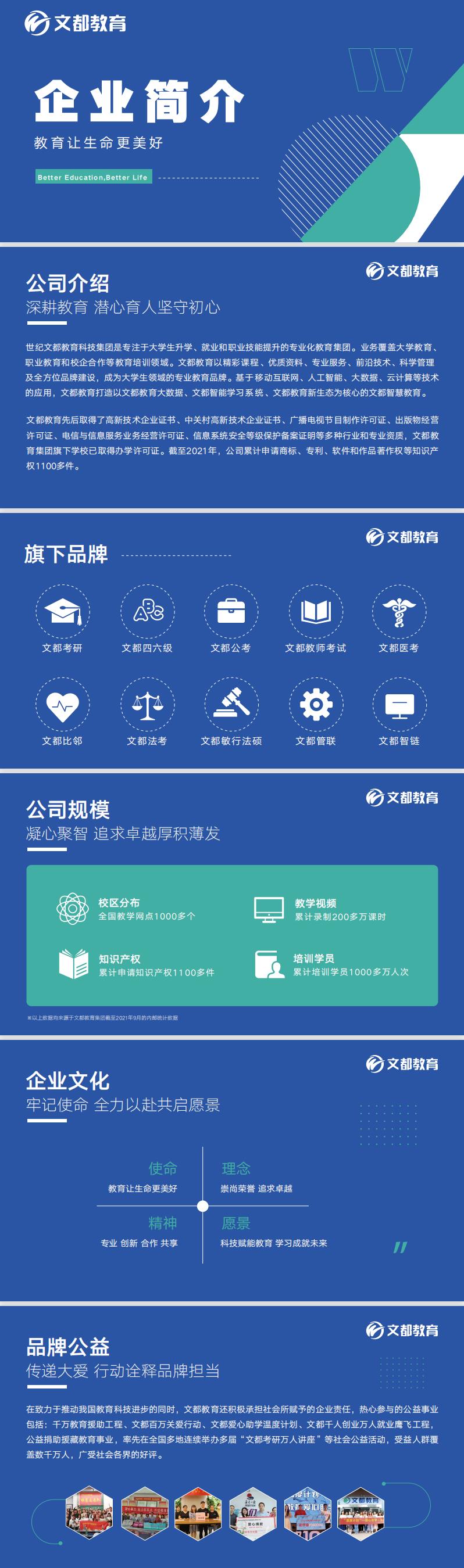 青岛作为山东省的重要城市,考研需求量也比较大,这为考研辅导机构提供了广阔的市场。世纪文都教育科技集团股份有限公司(文都教育)是专注为以大学生为主体的Y12人群提供升学、就业和职业技能提升的专业化智慧教育平台。业务覆盖研究生教育、公职教育、医学教育、艺术教育、IT教育、法律教育、财经教育、专升本、出国留学和校企合作等教育培训领域。文都教育以精彩课程、优质资料、专业服务、前沿技术、科学管理及全方位品牌建设,已成为备受大学生欢迎的品牌。基于移动互联网、人工智能、大数据、云计算等技术的应用,文都教育打造以文都教育大数据、文都智能学习系统、文都教育新生态为核心的文都智慧教育体系。