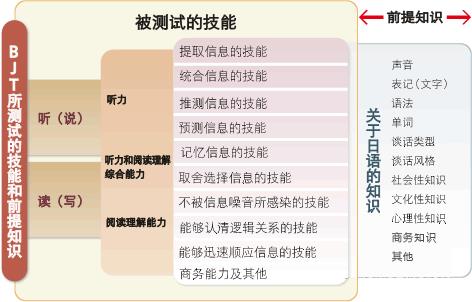 BJT是以具有语法、词汇、汉字等的知识为前提,针对是否能灵活运用这些知识,对所面临的信息进行适当处理这一交流能力进行客观测试的考试。因此,需要运用日语的所有商务场合均为考试范围。