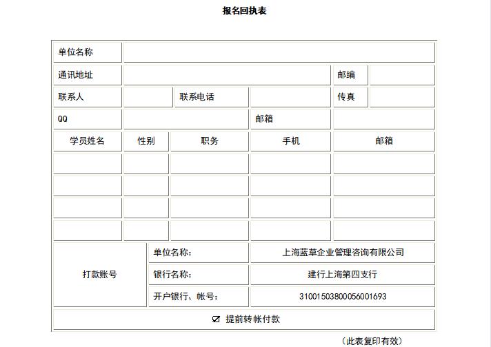 此表所填信息仅用于招生工作,对所填写的客户信息,我司严格保密,如需参加请填写回传给我们,以便及时为您安排会务并发确认函,谢谢支持!