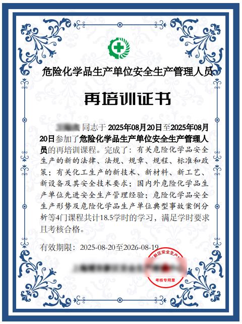 危险化学品生产单位安全生产管理人员再培训证书
