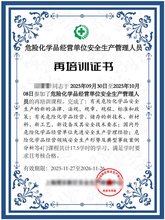 危险化学品经营单位安全生产管理人员再培训证书