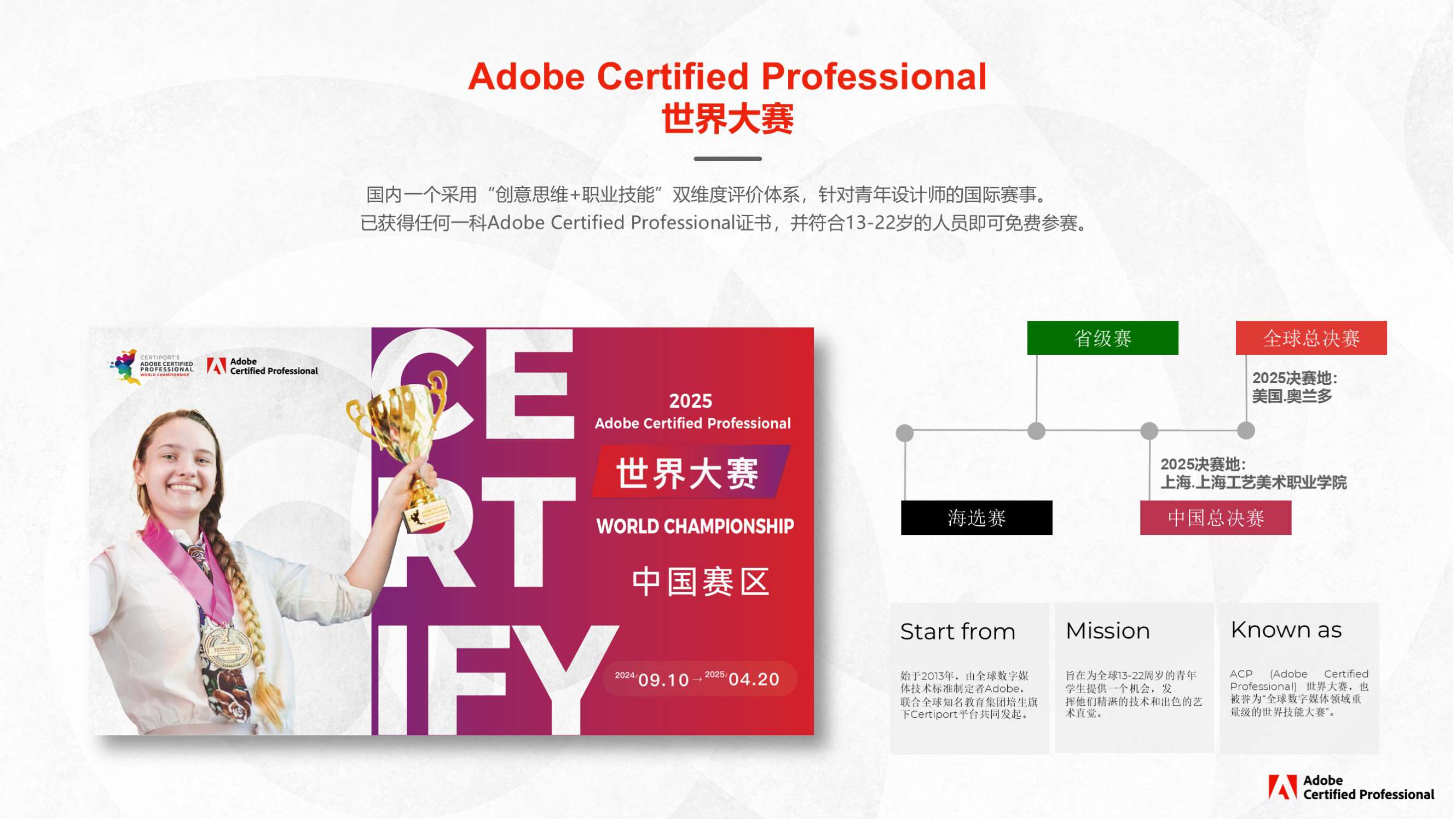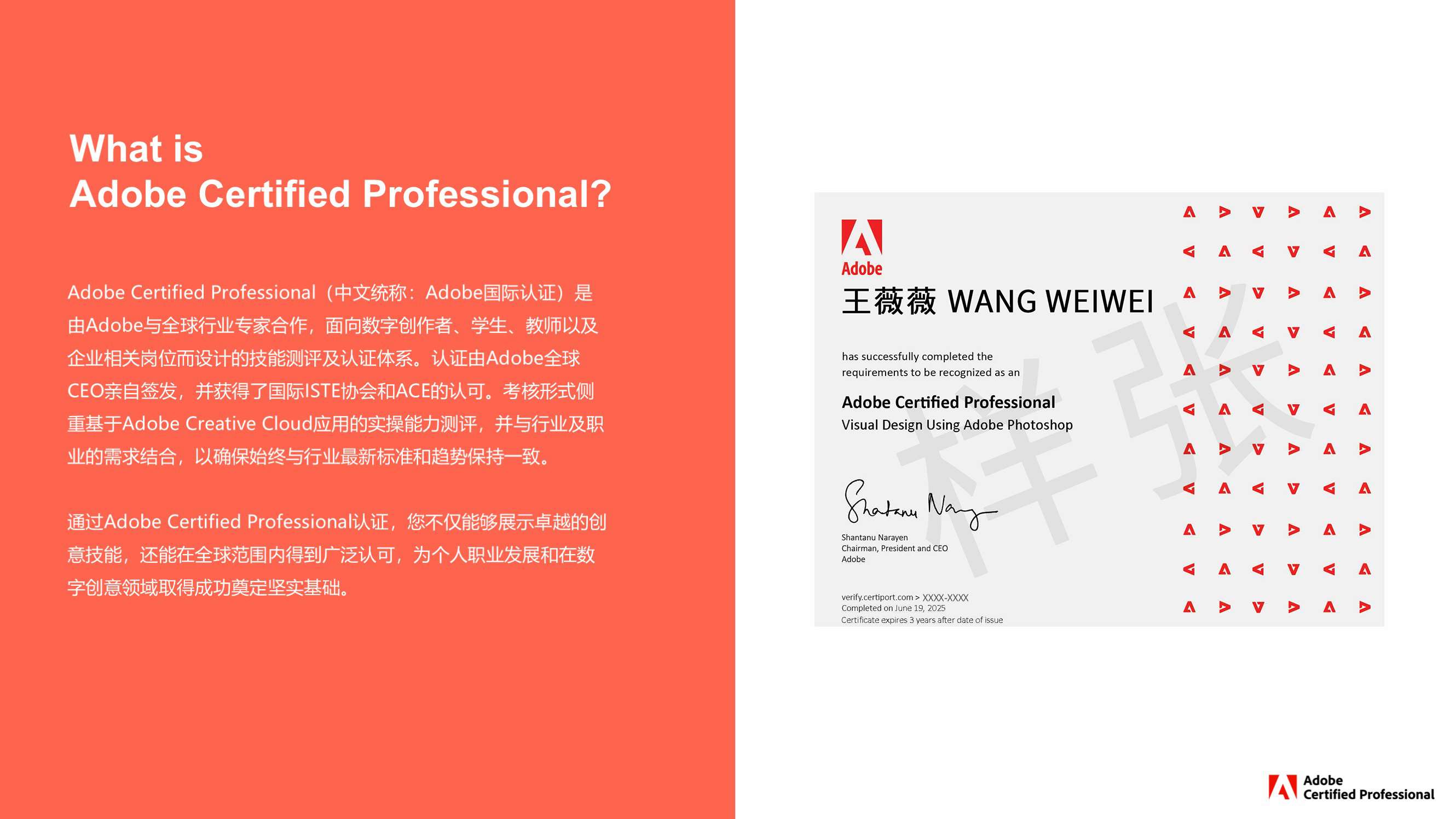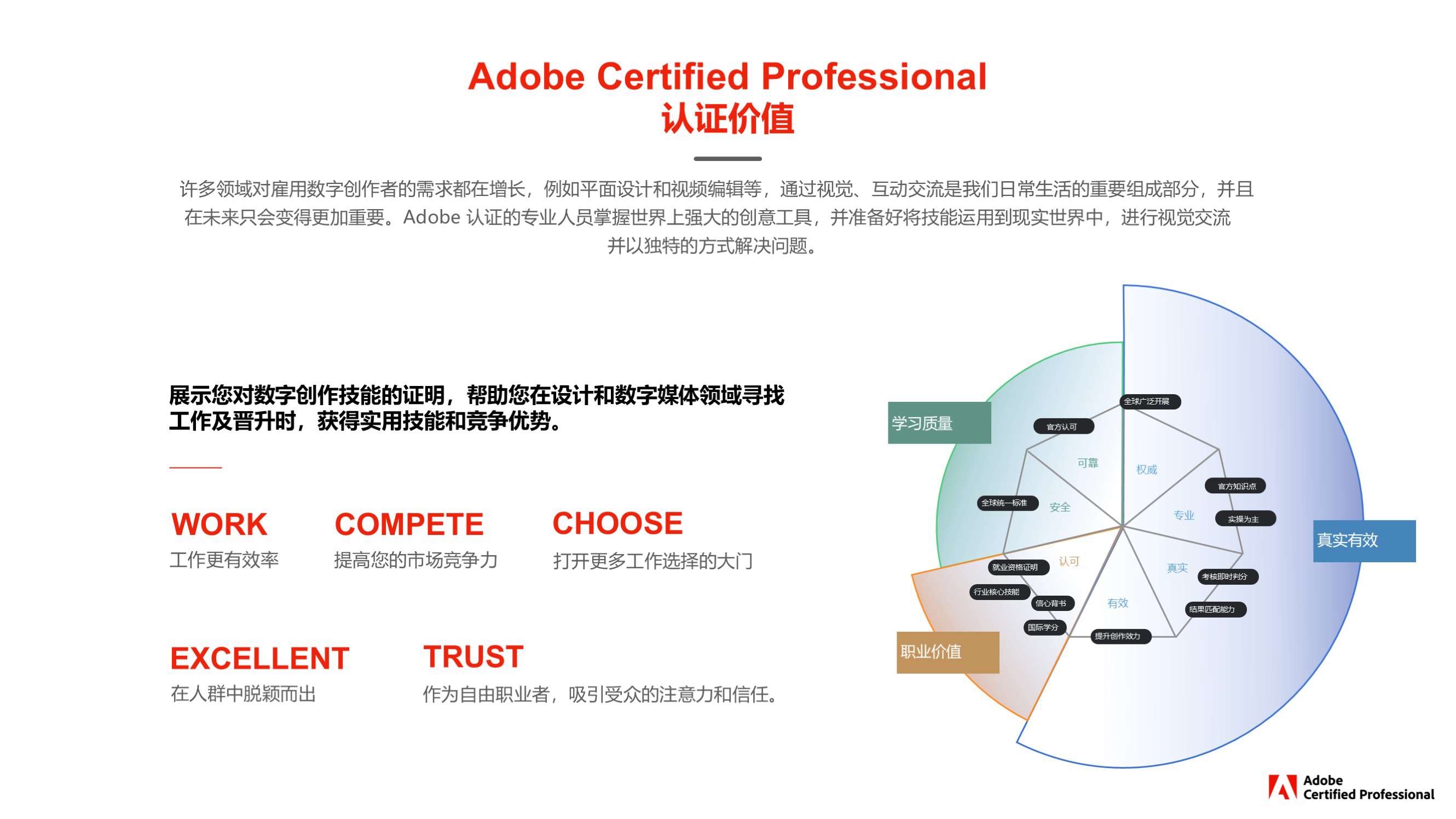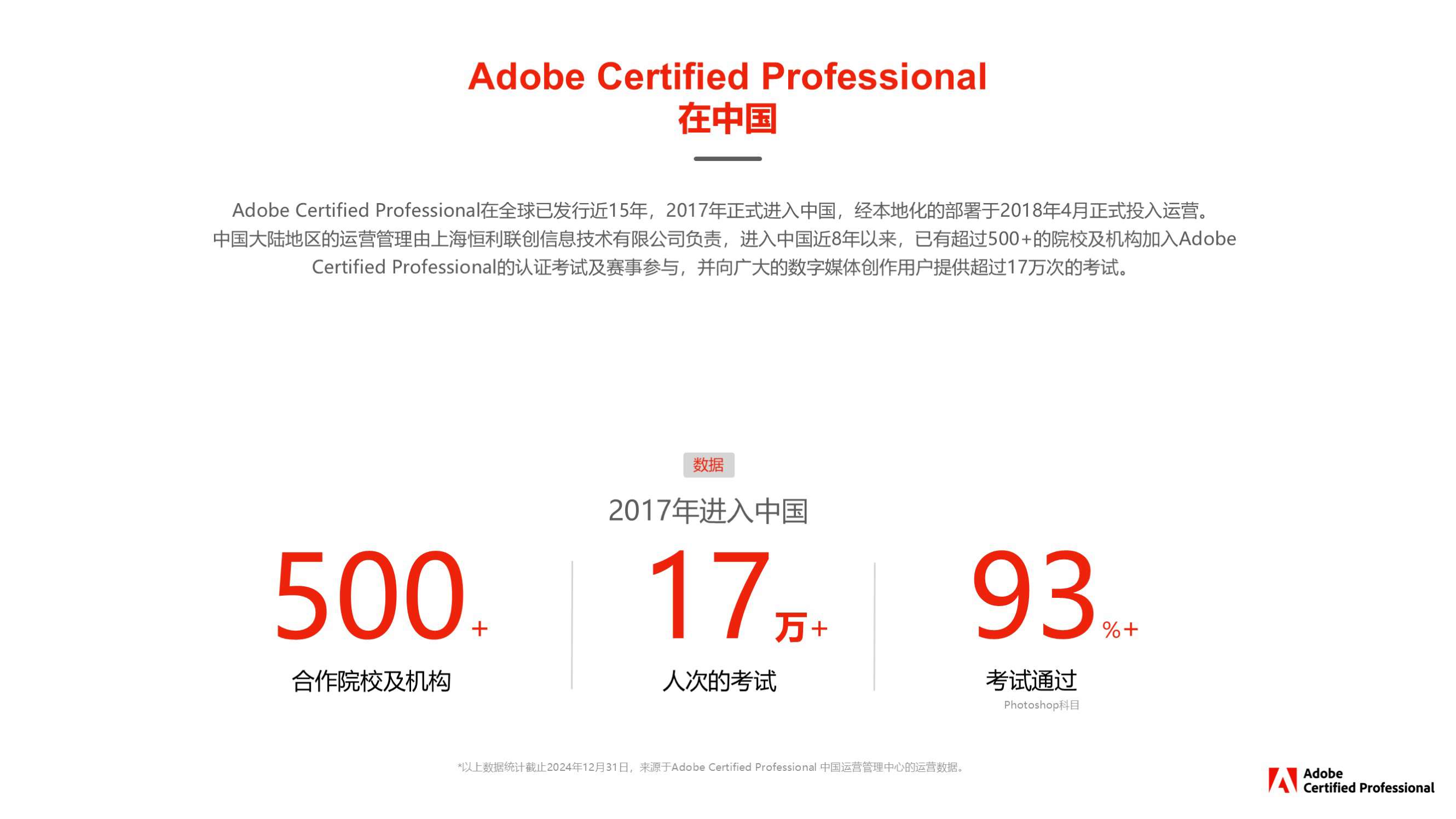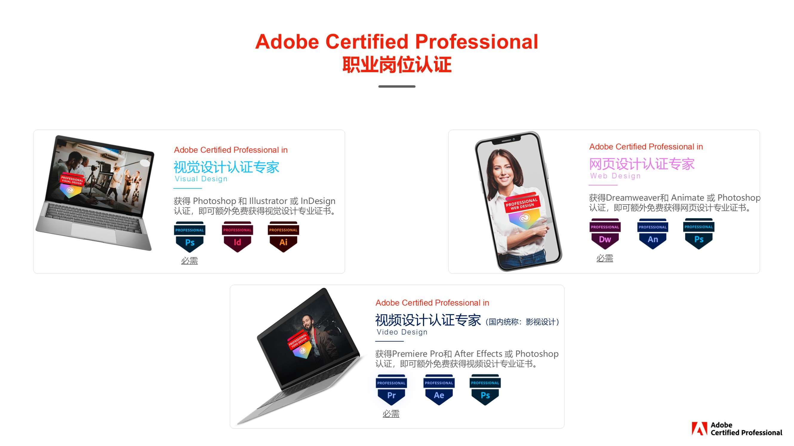 Adobe Certified Professional认证体系2017年引入中国,并由Adobe Certified Professional中国运营管理中心(恒利联创)进行运营管理,通过引进国际化的数字技能培训标准和体系,为广大的院校及培训机构提供师资的培训、教学的体系、人员的测评标准,让学员真正的学以致用,提高数字技能的水平及能力。