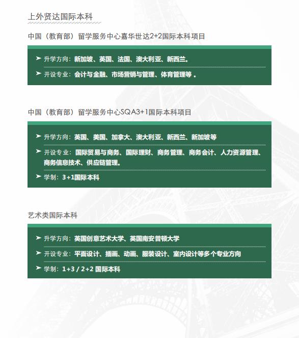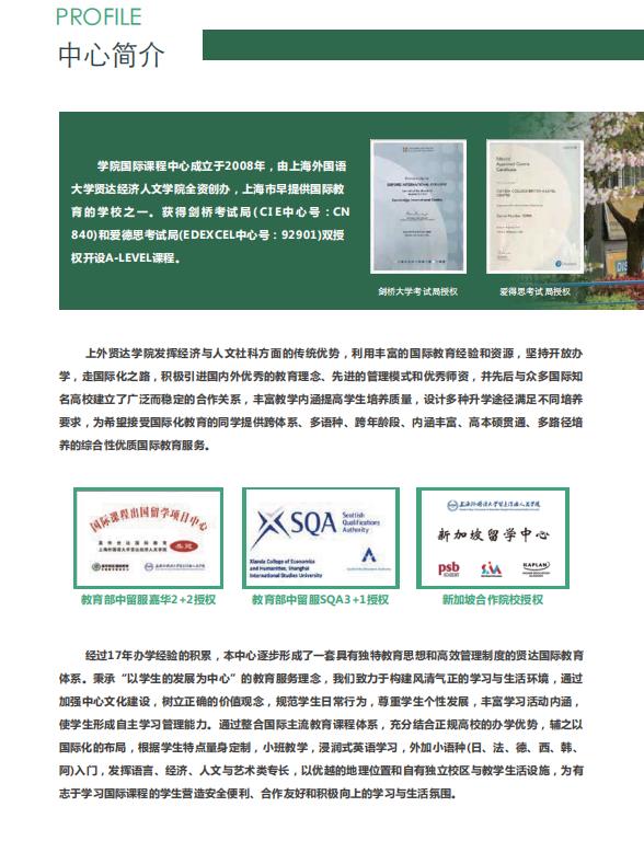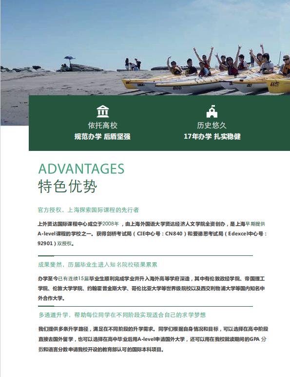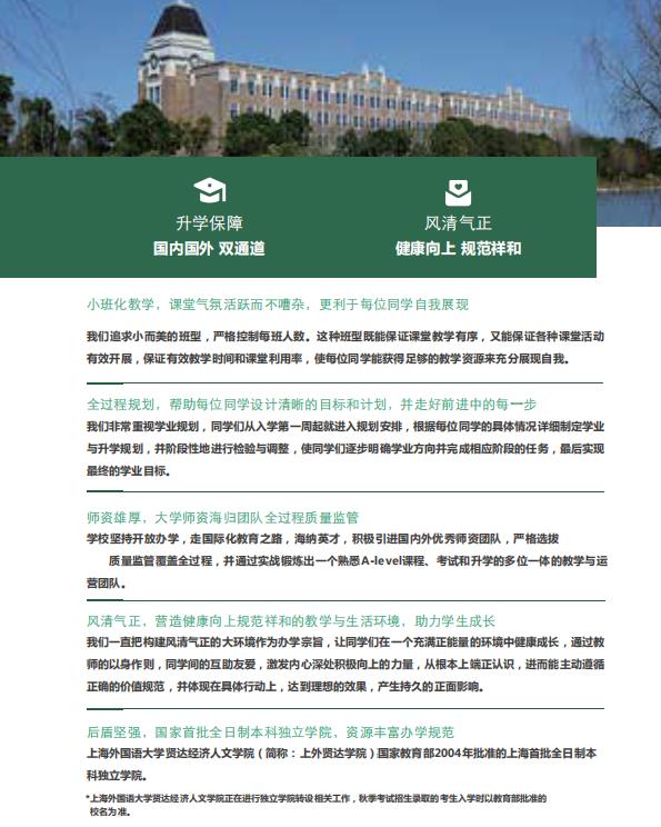 上外贤达学院发挥经济与人文社科方面的传统优势,利用丰富的国际教育经验和资源,坚持开放办学,走国际化之路,积极引进国内外优秀的教育理念、先进的管理模式和优秀师资,并先后与众多国际知名高校建立了广泛而稳定的合作关系,丰富教学内涵提高学生培养质量,设计多种升学途径满足不同培养要求,为希望接受国际化教育的同学提供跨体系、多语种、跨年龄段、内涵丰富、高本硕贯通、多路径培养的综合性优质国际教育服务。