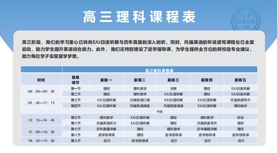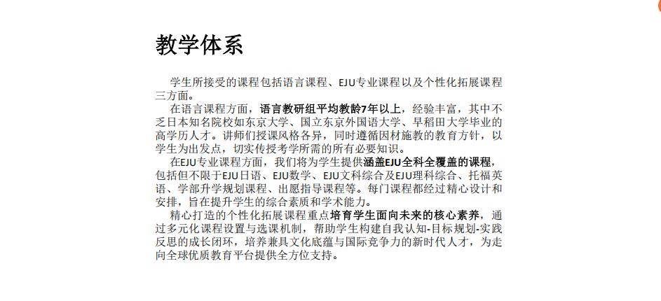 在EJU专业课程方面,我们将为学生提供涵盖EJU全科全覆盖的课程,包括但不限于EJU日语、EJU数学、EJU文科综合及EJU理科综合、托福英语、学部升学规划课程、出愿指导课程等。每门课程都经过精心设计和安排,旨在提升学生的综合素质和学术能力。精心打造的个性化拓展课程重点培育学生面向未来的核心素养,通过多元化课程设置与选课机制,帮助学生构建自我认知-目标规划-实践反思的成长闭环,培养兼具文化底蕴与国际竞争力的新时代人才,为走向全球优质教育平台提供全方位支持。