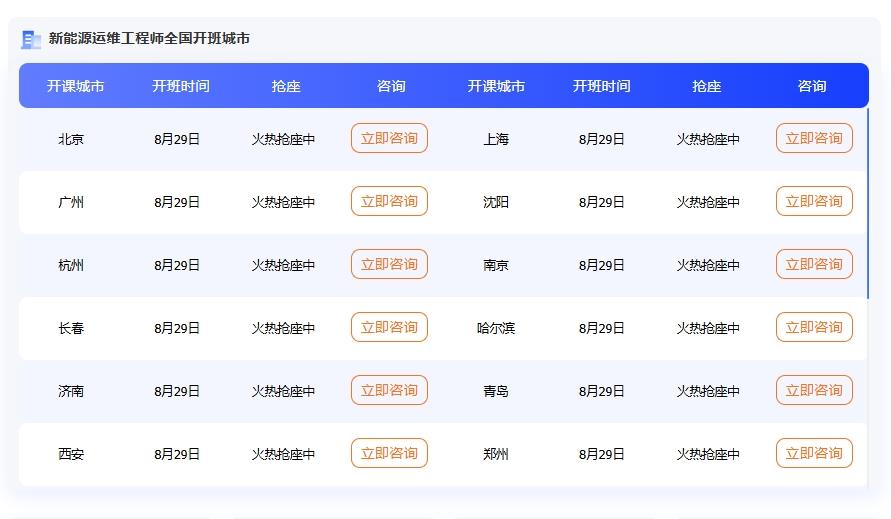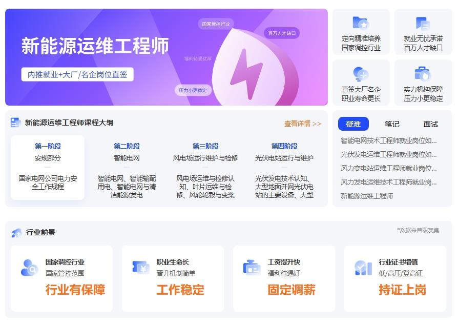 第一阶段:新能源基础理论、运维实操、设备认知、企业案例模拟等。掌握电力系统、安全规范、光伏组件、逆变器、风电齿轮箱、故障排查、数据监控、智能电网运维流程、清洁维护等