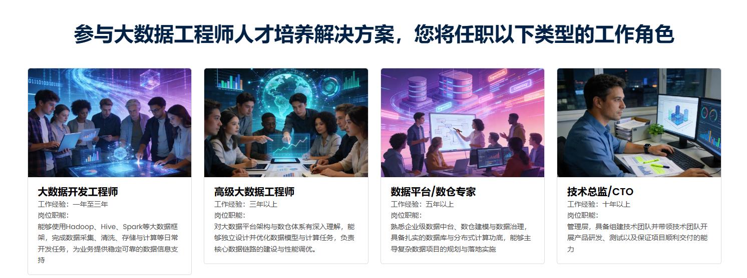 计算机、软件工程、信息管理、数学、统计学、电子信息等相关专业的本科及硕士人群,希望以大数据技术作为未来核心职业方向,提前构建工程化实践能力。
