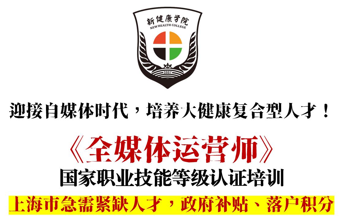 为培养既懂健康管理又掌握全媒体运营的复合型人才,上海新健康进修学院现重磅推出《全媒体运营师》国家职业技能等级认证培训。考试合格,不仅可获得国家权威认证,更可享受多重政府补贴、上海落户积分等重磅优待,助你抢占职业发展制高点。