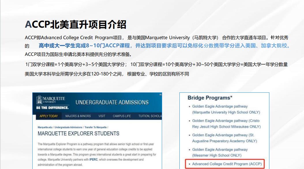 ACCP即Advanced College Credit Program项目, 是与美国Marquette University(马凯特大学) 合作的大学直通车项目。针对优秀的ACCP项目为国际生申请北美本科提供充分的学术准备。