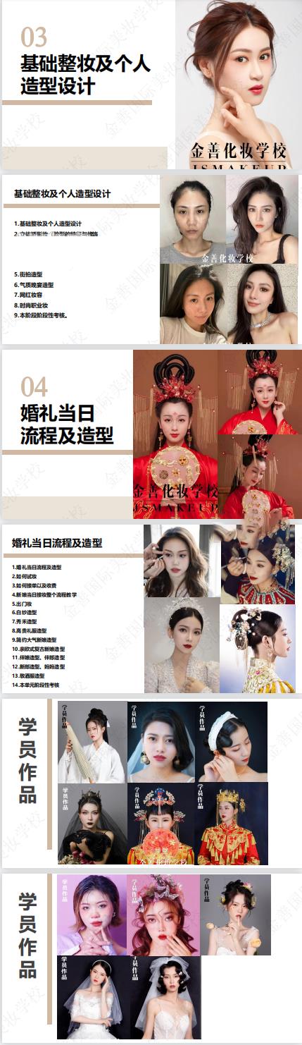 机构简介:【金善国际美妆培训】是集教育、产品、就业、管理、创业为一体的美业公司。集国内知名教师,师资力量雄厚。我们以环境、设备、教学质量,致力于为广大渴望从事美业的每位学员提供优质、专业的培训课程。我们是走在市场前沿、精英荟萃、人才辈出的现代培训机构。秉承着“诚信、时尚、技术”为本的理念在业内赢得了上好的口碑。用实力和良好的口碑提升美妆行业地位,引领美业新风尚,开创美业新纪元!我们按照严禁的教学路线和科学的学习内容,循序渐进,力求多元化,使学员获得个人技术能力、营销理念、实战经验等多方面总体提升,直至成为美业全能型高端人才。在业内赢得了良好的口碑,为业界培育出了大批优秀人才,实现自主创业、体现自我价值、成就梦想人生!