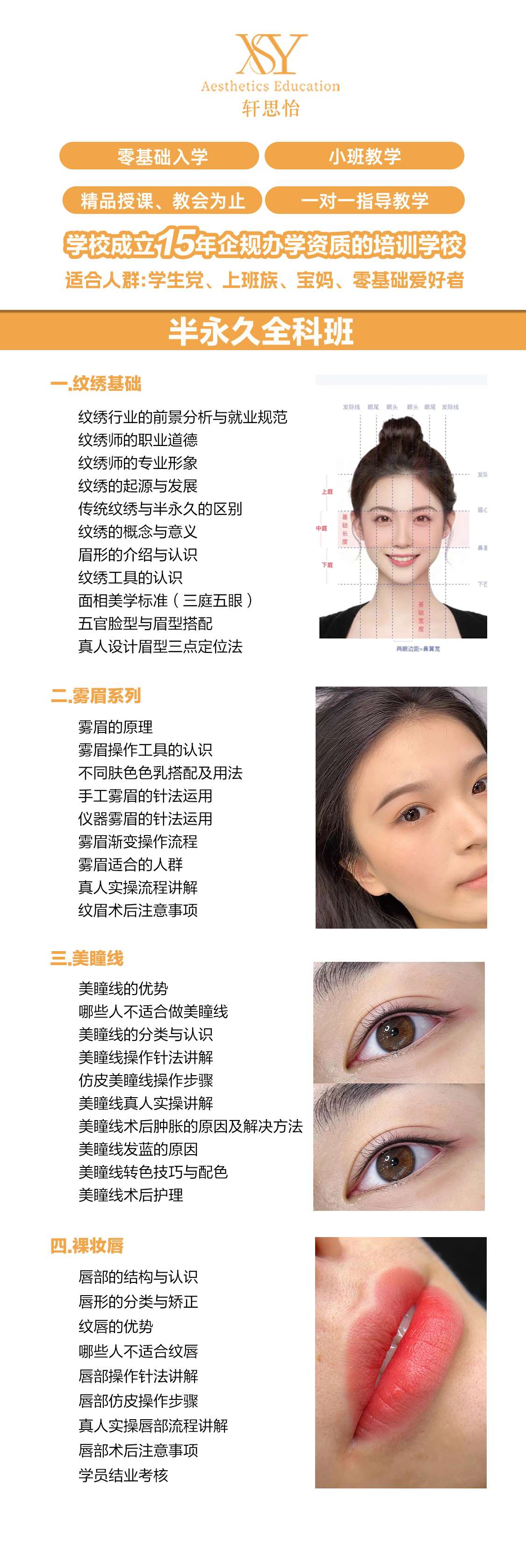 机构简介:轩思怡美妆教育培训学校坐落于素有“人间天堂”之称的古城苏州,是一家致力于打造百万女性成功创业的教育培训机构。轩思怡为苏州蓬艺思形象设计总公司旗下全资子公司,经历15年打磨,蓬思来发展成为华东地区连锁美业培训机构。在吴中、园区、新区等区域设有校区,且全国16家联合姐妹校区。优质教师队伍:拥有经验丰富、富有激情的教师团队,深知如何激发学生的学习热情、引导他们掌握知识,培养学生的创新能力、解决问题的能力。多元课程设置:提供全面且多样化的课程,包含国际彩妆、高端美甲、韩式半永久、皮肤管理、时尚美发、主播培养、创业经营管理等多科。关爱学生成长:关注每一个学生的职业发展,尽可能让每位学员在学习创业就业路上找到自己的定位和激情,我们还注重培养自有人才,将优秀的学生直接留校培养,全面发展。坚守“创新教学、品质为本”办学理念,从宏观美学到微观创业,同时为社会输送一批批优秀的美业技能人才!轩思怡--品牌升级 从【新】出发!针对人群:工厂女工、宝妈、白领、下岗再就业等等对美业热爱的