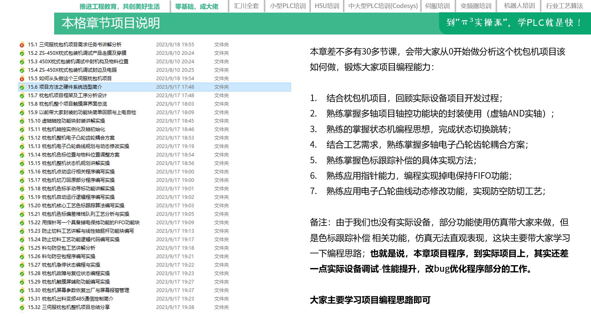 机构简介:01 PLC初学者的困惑很多PLC初学者感到疑惑,自己已经很努力了,看了很多PLC视频课程,或者是报了一些PLC培训机构线下培训班,学了一大堆乱七八糟的指令或者各种单个功能,花费了不少时间,对于基础的一些专业名词也有所了解了,但是拿到一个项目依然觉得老鼠啃天,感觉无法下手,这到底是什么原因呢?我们学习PLC最终的目的就是能独立写PLC设备项目程序,能够独挡一面,成为合格的PLC电气工程师,提升自己的工资天花板,但是入行学习的大多数人会发现,距离这个目标很远!这到底是为什么?02 初学者困惑的答案其实答案很简单,因为你压根没有学习编写项目程序的方法啊!你的学习方法不对啊!你天天看人家讲各种乱七八糟的指令,看人家读PPT,看人家搞起保停,看人家摆弄中间继电器。有些人不服气,我会跑马灯程序啊,星三角程序啊,起保停啊,常用的指令啊!是的,这些你确实会,但是你会的这些跟不会有多大区别呢? 你学的这些玩意是教师爷混时间的!事实摆在那里的,只是你不明白,因为你是小白,不懂。找工作的时候人家不关心你会不会起保停,人家关心的是你能不能拿下一套设备的完整项目程序,能不能独立做出来,。现在自动化设备已经不是起保停程序能搞定的了,一套完整设备有固有的框架结构的,手动控制程序、手动示教程序、回原控制程序、自动控制程序、参数初始化程序、EtherCAT总线初始化、参数赋值程序、工位的任意屏蔽、IO输出程序、单元的循环、单步运行、模块化编程、面向对象封装功能块等等。这些结构你听都没听过,学几个指令怎么可能就会了?!你又不是神童,非要把自己搞成神童,偏偏我们这一行你是装不过去的,你到底会不会,给个项目写一套程序就知道了!03 初学者浪费了太多时间和精力所以大多初学者在指令等基础知识上浪费了太多的时间,但是正真的基础知识也不会,因为你没有放到实际项目案例上应用,让搞个PLC选型,连同品牌下同系列的PLC型号啥功能都说不上来!所以你学一些干巴巴指令记也记不住,用也不会用。其实指令这些基础知识不用记忆,用的时候查找手册就可以了。这也是我们常说的 工业自动化是开卷的,我们需要掌握科学的问题分析方法,然后根据现象去分析,梳理出可能的原因后再去做排除法,最终就能定位到我们所需要的问题的答案上。所以一切都是浪费了自己大把时间,对于某些朋友来说也是没办法的,因为自己接触的资料就是这些,全是念PPT,讲指令一类的,另外大部分培训机构的水平都很菜,很多老师都是应届生培训一段时间没有实际项目经验就开始教学员,你想想跟着这样的老师你怎么可能学的好!而我们实操派的老师,是汇川工作了5年以上的工程师出身,都是实打实做过很多小型PLC脉冲控制、中大型PLC-codesys、EtherCAT总线多轴运动控制实战项目的,选对老师,才能保证你在这个行业能走的远!走的顺!04 初学者到底该怎么学?对于个人到底该怎么学PLC,才能达到独立做项目水平,能独当一面,实现零基础小白到PLC电气工程师的蜕变,提升自己的工资天花板?个人建议跟着实操派系统化全科班课程走一遍啥都会了!系统化大课全科班,把该讲的知识点都用项目的方式讲透了,实操派课程通过PBL项目式,循序渐进的带大家做了很多个项目,逐步打怪进阶,从零基础入门开始到进阶到高阶项目式教学,不像传统培训机构讲一堆没用的指令,都是通过实战项目,在实操中编程学习PLC。如果是有经验的小伙伴,就能发现其实一套完整项目程序用到的指令其实就常用的那么些个!对于PLC初学者而言,入门学习方式就是能找一套从0开始讲解怎么写一套完整项目程序的课程,我说的完整项目框架的编写课程,什么是完整框架的程序?就是包含点动控制、示教程序、回原控制、自动控制、报警控制、参数赋值控制、IO输出、总复位初始化,单元循环,工位任意屏蔽,单步运行,空跑、暂停、循停、急停、手自动任意切换等完整功能的,成熟的,能够稳定运行的实际项目程序。你想想,你连一套完整项目程序的框架都不知道,连一套完整项目程序怎么来的都没见过,你怎么可能写得了程序了? 实操派课程都是从0开始边写边讲一套完整项目程序的编写过程,课程中应用的程序是经过多年验证过的项目程序框架,初学者可以直接套用!05 实操派的课程理念我们的课程理念,教会学员“做菜”,从第五章开始都是项目式实操培训。不像传统培训机构讲一堆没用的指令!就像做菜,市面上好多培训机构告诉你各种原材料,讲原材料介绍一堆,但是怎么做菜的死活说不清楚。他们讲一堆乱七八糟的指令,而我们通过讲项目串知识,教大家实用的项目编程框架,然后告诉大家如何查手册,如何自学习!我们的课程开发逻辑都是“总分总”式逻辑。通过项目任务书,讲清楚当前课程项目要实现的具体功能(以终为始);然后对当前项目进行模块化拆分,分而治之,模块化课程开发(和编程思想一样);最后项目进行调试总结,知识回顾(总)而且课程中穿插各种实操,手把手教学,都是项目式实战。从简单小项目10来行代码 -> 上百行代码->几百行代码项目->上千行代码项目->几千行/.上万行 代码项目,保证都是一行一行带大家敲的,给大家分析清楚写项目程序的内在逻辑,只要大家能认真跟着我们课程节奏实操,可以做到全部项目功能复现。06 行业发展的大趋势,学会顺势而为目前行业