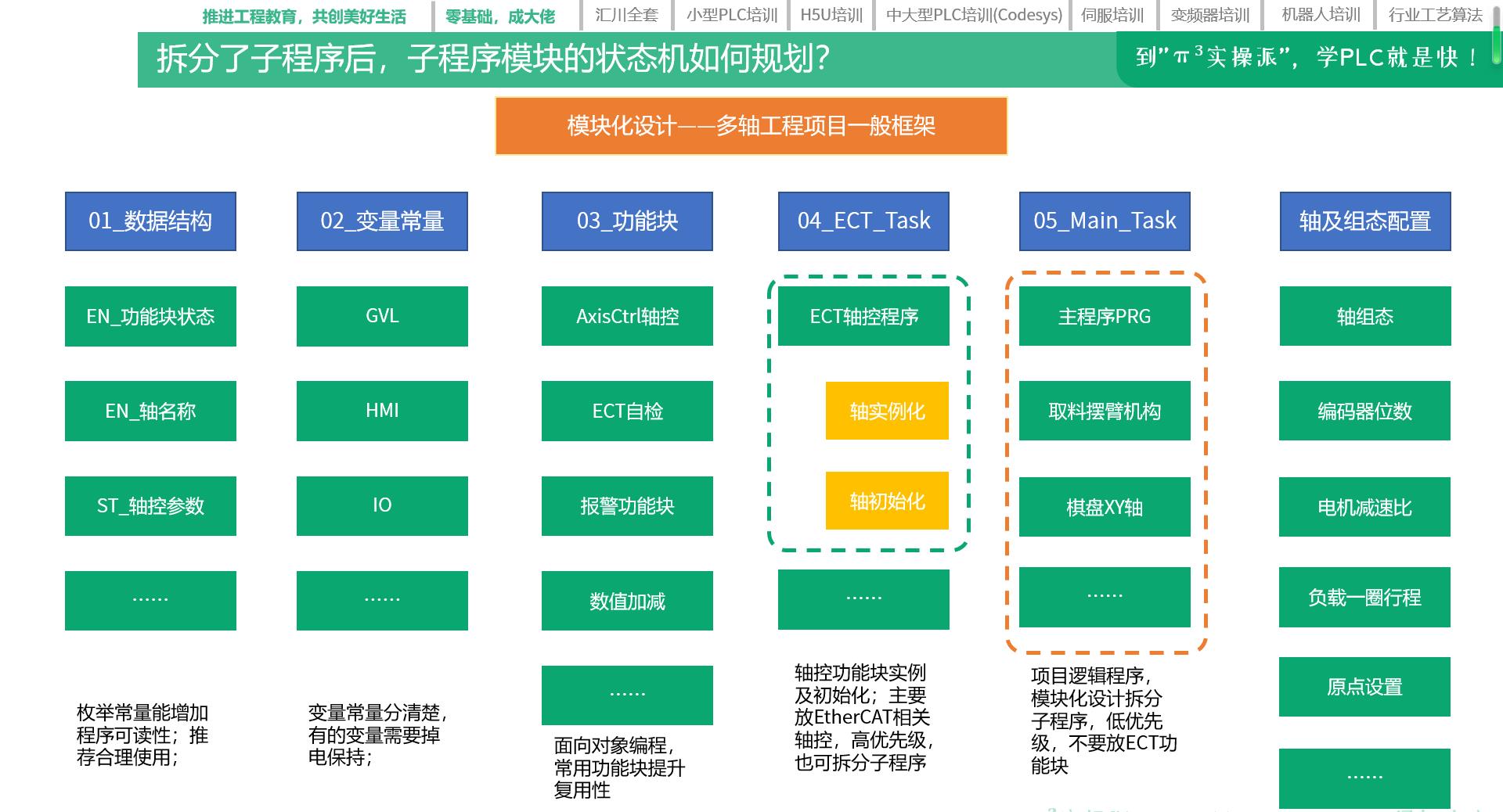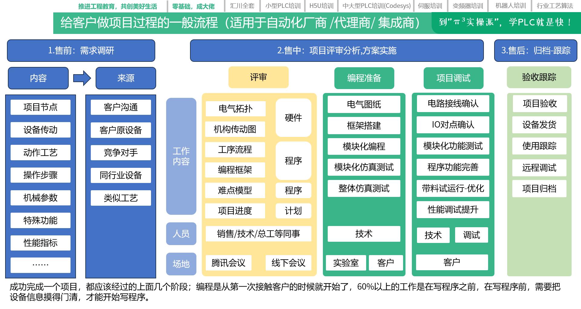机构简介:01 PLC初学者的困惑很多PLC初学者感到疑惑,自己已经很努力了,看了很多PLC视频课程,或者是报了一些PLC培训机构线下培训班,学了一大堆乱七八糟的指令或者各种单个功能,花费了不少时间,对于基础的一些专业名词也有所了解了,但是拿到一个项目依然觉得老鼠啃天,感觉无法下手,这到底是什么原因呢?我们学习PLC最终的目的就是能独立写PLC设备项目程序,能够独挡一面,成为合格的PLC电气工程师,提升自己的工资天花板,但是入行学习的大多数人会发现,距离这个目标很远!这到底是为什么?02 初学者困惑的答案其实答案很简单,因为你压根没有学习编写项目程序的方法啊!你的学习方法不对啊!你天天看人家讲各种乱七八糟的指令,看人家读PPT,看人家搞起保停,看人家摆弄中间继电器。有些人不服气,我会跑马灯程序啊,星三角程序啊,起保停啊,常用的指令啊!是的,这些你确实会,但是你会的这些跟不会有多大区别呢? 你学的这些玩意是教师爷混时间的!事实摆在那里的,只是你不明白,因为你是小白,不懂。找工作的时候人家不关心你会不会起保停,人家关心的是你能不能拿下一套设备的完整项目程序,能不能独立做出来,。现在自动化设备已经不是起保停程序能搞定的了,一套完整设备有固有的框架结构的,手动控制程序、手动示教程序、回原控制程序、自动控制程序、参数初始化程序、EtherCAT总线初始化、参数赋值程序、工位的任意屏蔽、IO输出程序、单元的循环、单步运行、模块化编程、面向对象封装功能块等等。这些结构你听都没听过,学几个指令怎么可能就会了?!你又不是神童,非要把自己搞成神童,偏偏我们这一行你是装不过去的,你到底会不会,给个项目写一套程序就知道了!03 初学者浪费了太多时间和精力所以大多初学者在指令等基础知识上浪费了太多的时间,但是正真的基础知识也不会,因为你没有放到实际项目案例上应用,让搞个PLC选型,连同品牌下同系列的PLC型号啥功能都说不上来!所以你学一些干巴巴指令记也记不住,用也不会用。其实指令这些基础知识不用记忆,用的时候查找手册就可以了。这也是我们常说的 工业自动化是开卷的,我们需要掌握科学的问题分析方法,然后根据现象去分析,梳理出可能的原因后再去做排除法,最终就能定位到我们所需要的问题的答案上。所以一切都是浪费了自己大把时间,对于某些朋友来说也是没办法的,因为自己接触的资料就是这些,全是念PPT,讲指令一类的,另外大部分培训机构的水平都很菜,很多老师都是应届生培训一段时间没有实际项目经验就开始教学员,你想想跟着这样的老师你怎么可能学的好!而我们实操派的老师,是汇川工作了5年以上的工程师出身,都是实打实做过很多小型PLC脉冲控制、中大型PLC-codesys、EtherCAT总线多轴运动控制实战项目的,选对老师,才能保证你在这个行业能走的远!走的顺!04 初学者到底该怎么学?对于个人到底该怎么学PLC,才能达到独立做项目水平,能独当一面,实现零基础小白到PLC电气工程师的蜕变,提升自己的工资天花板?个人建议跟着实操派系统化全科班课程走一遍啥都会了!系统化大课全科班,把该讲的知识点都用项目的方式讲透了,实操派课程通过PBL项目式,循序渐进的带大家做了很多个项目,逐步打怪进阶,从零基础入门开始到进阶到高阶项目式教学,不像传统培训机构讲一堆没用的指令,都是通过实战项目,在实操中编程学习PLC。如果是有经验的小伙伴,就能发现其实一套完整项目程序用到的指令其实就常用的那么些个!对于PLC初学者而言,入门学习方式就是能找一套从0开始讲解怎么写一套完整项目程序的课程,我说的完整项目框架的编写课程,什么是完整框架的程序?就是包含点动控制、示教程序、回原控制、自动控制、报警控制、参数赋值控制、IO输出、总复位初始化,单元循环,工位任意屏蔽,单步运行,空跑、暂停、循停、急停、手自动任意切换等完整功能的,成熟的,能够稳定运行的实际项目程序。你想想,你连一套完整项目程序的框架都不知道,连一套完整项目程序怎么来的都没见过,你怎么可能写得了程序了? 实操派课程都是从0开始边写边讲一套完整项目程序的编写过程,课程中应用的程序是经过多年验证过的项目程序框架,初学者可以直接套用!05 实操派的课程理念我们的课程理念,教会学员“做菜”,从第五章开始都是项目式实操培训。不像传统培训机构讲一堆没用的指令!就像做菜,市面上好多培训机构告诉你各种原材料,讲原材料介绍一堆,但是怎么做菜的死活说不清楚。他们讲一堆乱七八糟的指令,而我们通过讲项目串知识,教大家实用的项目编程框架,然后告诉大家如何查手册,如何自学习!我们的课程开发逻辑都是“总分总”式逻辑。通过项目任务书,讲清楚当前课程项目要实现的具体功能(以终为始);然后对当前项目进行模块化拆分,分而治之,模块化课程开发(和编程思想一样);最后项目进行调试总结,知识回顾(总)而且课程中穿插各种实操,手把手教学,都是项目式实战。从简单小项目10来行代码 -> 上百行代码->几百行代码项目->上千行代码项目->几千行/.上万行 代码项目,保证都是一行一行带大家敲的,给大家分析清楚写项目程序的内在逻辑,只要大家能认真跟着我们课程节奏实操,可以做到全部项目功能复现。06 行业发展的大趋势,学会顺势而为目前行业