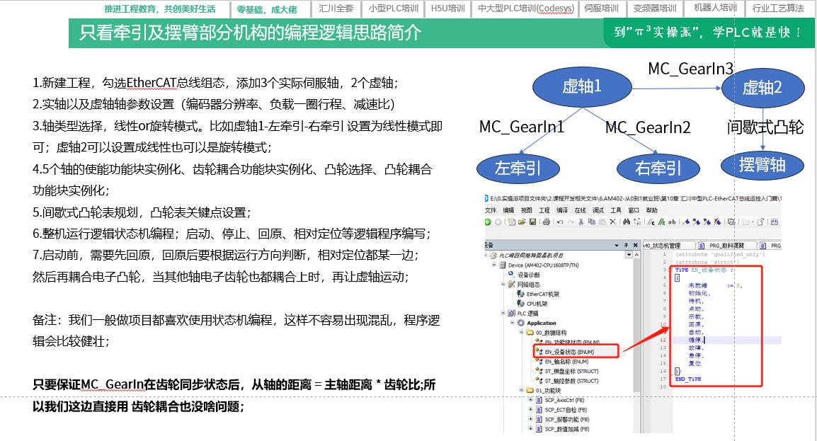 机构简介:01 PLC初学者的困惑很多PLC初学者感到疑惑,自己已经很努力了,看了很多PLC视频课程,或者是报了一些PLC培训机构线下培训班,学了一大堆乱七八糟的指令或者各种单个功能,花费了不少时间,对于基础的一些专业名词也有所了解了,但是拿到一个项目依然觉得老鼠啃天,感觉无法下手,这到底是什么原因呢?我们学习PLC最终的目的就是能独立写PLC设备项目程序,能够独挡一面,成为合格的PLC电气工程师,提升自己的工资天花板,但是入行学习的大多数人会发现,距离这个目标很远!这到底是为什么?02 初学者困惑的答案其实答案很简单,因为你压根没有学习编写项目程序的方法啊!你的学习方法不对啊!你天天看人家讲各种乱七八糟的指令,看人家读PPT,看人家搞起保停,看人家摆弄中间继电器。有些人不服气,我会跑马灯程序啊,星三角程序啊,起保停啊,常用的指令啊!是的,这些你确实会,但是你会的这些跟不会有多大区别呢? 你学的这些玩意是教师爷混时间的!事实摆在那里的,只是你不明白,因为你是小白,不懂。找工作的时候人家不关心你会不会起保停,人家关心的是你能不能拿下一套设备的完整项目程序,能不能独立做出来,。现在自动化设备已经不是起保停程序能搞定的了,一套完整设备有固有的框架结构的,手动控制程序、手动示教程序、回原控制程序、自动控制程序、参数初始化程序、EtherCAT总线初始化、参数赋值程序、工位的任意屏蔽、IO输出程序、单元的循环、单步运行、模块化编程、面向对象封装功能块等等。这些结构你听都没听过,学几个指令怎么可能就会了?!你又不是神童,非要把自己搞成神童,偏偏我们这一行你是装不过去的,你到底会不会,给个项目写一套程序就知道了!03 初学者浪费了太多时间和精力所以大多初学者在指令等基础知识上浪费了太多的时间,但是正真的基础知识也不会,因为你没有放到实际项目案例上应用,让搞个PLC选型,连同品牌下同系列的PLC型号啥功能都说不上来!所以你学一些干巴巴指令记也记不住,用也不会用。其实指令这些基础知识不用记忆,用的时候查找手册就可以了。这也是我们常说的 工业自动化是开卷的,我们需要掌握科学的问题分析方法,然后根据现象去分析,梳理出可能的原因后再去做排除法,最终就能定位到我们所需要的问题的答案上。所以一切都是浪费了自己大把时间,对于某些朋友来说也是没办法的,因为自己接触的资料就是这些,全是念PPT,讲指令一类的,另外大部分培训机构的水平都很菜,很多老师都是应届生培训一段时间没有实际项目经验就开始教学员,你想想跟着这样的老师你怎么可能学的好!而我们实操派的老师,是汇川工作了5年以上的工程师出身,都是实打实做过很多小型PLC脉冲控制、中大型PLC-codesys、EtherCAT总线多轴运动控制实战项目的,选对老师,才能保证你在这个行业能走的远!走的顺!04 初学者到底该怎么学?对于个人到底该怎么学PLC,才能达到独立做项目水平,能独当一面,实现零基础小白到PLC电气工程师的蜕变,提升自己的工资天花板?个人建议跟着实操派系统化全科班课程走一遍啥都会了!系统化大课全科班,把该讲的知识点都用项目的方式讲透了,实操派课程通过PBL项目式,循序渐进的带大家做了很多个项目,逐步打怪进阶,从零基础入门开始到进阶到高阶项目式教学,不像传统培训机构讲一堆没用的指令,都是通过实战项目,在实操中编程学习PLC。如果是有经验的小伙伴,就能发现其实一套完整项目程序用到的指令其实就常用的那么些个!对于PLC初学者而言,入门学习方式就是能找一套从0开始讲解怎么写一套完整项目程序的课程,我说的完整项目框架的编写课程,什么是完整框架的程序?就是包含点动控制、示教程序、回原控制、自动控制、报警控制、参数赋值控制、IO输出、总复位初始化,单元循环,工位任意屏蔽,单步运行,空跑、暂停、循停、急停、手自动任意切换等完整功能的,成熟的,能够稳定运行的实际项目程序。你想想,你连一套完整项目程序的框架都不知道,连一套完整项目程序怎么来的都没见过,你怎么可能写得了程序了? 实操派课程都是从0开始边写边讲一套完整项目程序的编写过程,课程中应用的程序是经过多年验证过的项目程序框架,初学者可以直接套用!05 实操派的课程理念我们的课程理念,教会学员“做菜”,从第五章开始都是项目式实操培训。不像传统培训机构讲一堆没用的指令!就像做菜,市面上好多培训机构告诉你各种原材料,讲原材料介绍一堆,但是怎么做菜的死活说不清楚。他们讲一堆乱七八糟的指令,而我们通过讲项目串知识,教大家实用的项目编程框架,然后告诉大家如何查手册,如何自学习!我们的课程开发逻辑都是“总分总”式逻辑。通过项目任务书,讲清楚当前课程项目要实现的具体功能(以终为始);然后对当前项目进行模块化拆分,分而治之,模块化课程开发(和编程思想一样);最后项目进行调试总结,知识回顾(总)而且课程中穿插各种实操,手把手教学,都是项目式实战。从简单小项目10来行代码 -> 上百行代码->几百行代码项目->上千行代码项目->几千行/.上万行 代码项目,保证都是一行一行带大家敲的,给大家分析清楚写项目程序的内在逻辑,只要大家能认真跟着我们课程节奏实操,可以做到全部项目功能复现。06 行业发展的大趋势,学会顺势而为目前行业