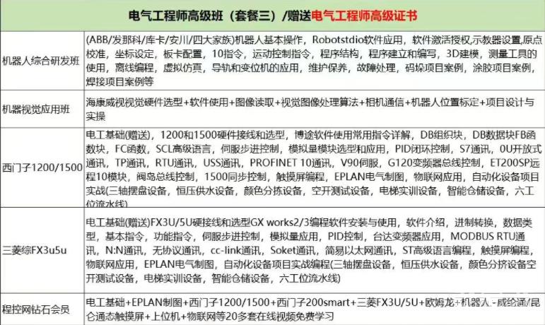 三菱FX(3u,5u)综合班+西门子1200/1500综合班+四大品牌机器人机器人操作,Robotstdio软件应用,软件激活授权,示教器设置原点校准,坐标设定,板卡配置,I0指令,运动控制指令,程序结构程序建立和编写,3D建模,测量工具的使用,离线编程,虚拟仿真,导轨和变位机的应用,CCD相机硬件配置和选型,相机功能介绍,视觉和机器人通讯,九点标定算法,相机案例应用,系统备份,维护保养,故障处理,系统管理功能,机器人视觉抓取项目案例,码垛项目案例,涂胶项目案例,焊接项目案例等