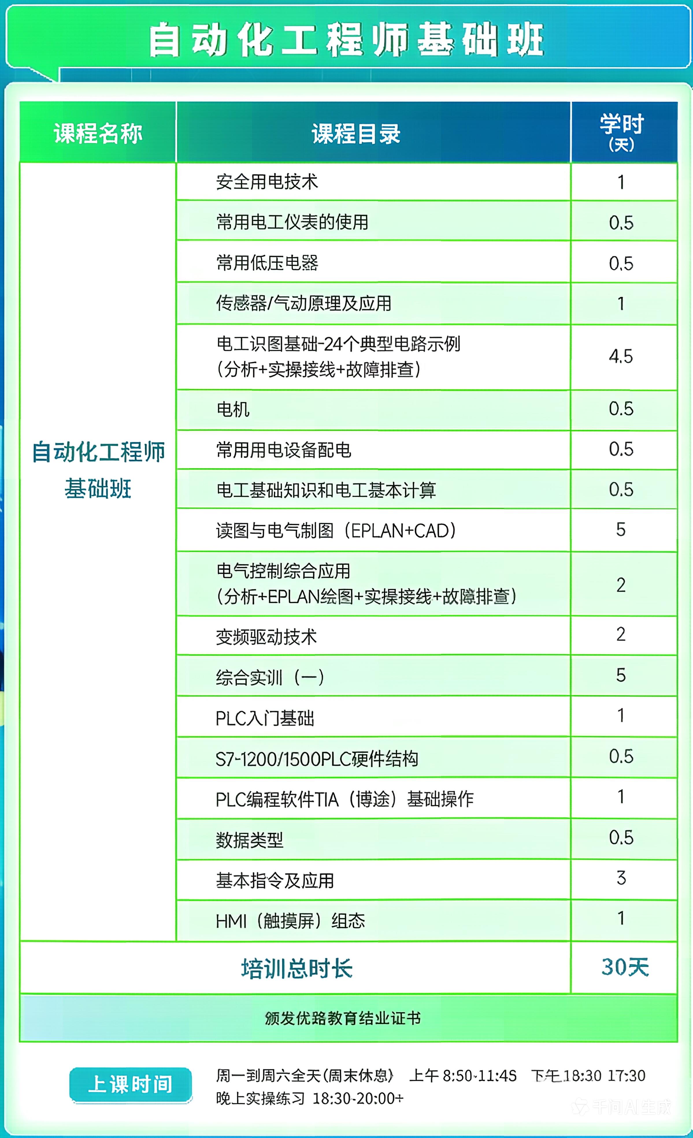 自动化工程师基础班主要学习内容:常用低压电器(原理/识图/接线);识读PLC程序;故障排查;简单控制柜配盘;综合实训(一)。
