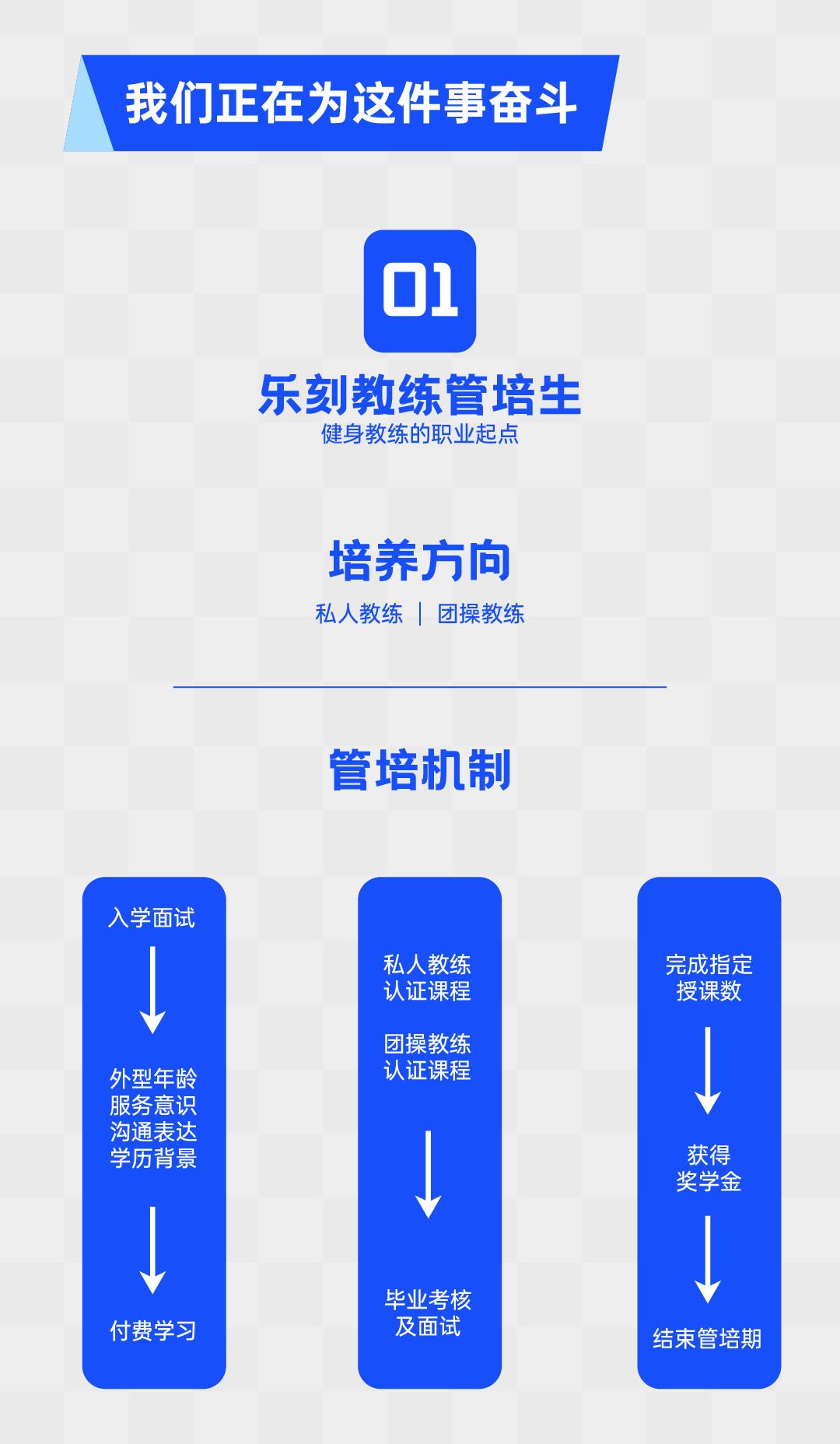 长期以来,乐刻致力于为用户提供便利化、高性价比、个性化、温暖快乐的运动健身服务,凭借“月付制”、“24小时”、“智能化”、“全程无推销”、“海量优质团体课”等特征重新定义小型化健身房“乐刻健身”,树立“国民健身房”标准,打造“一公里健身圈”。