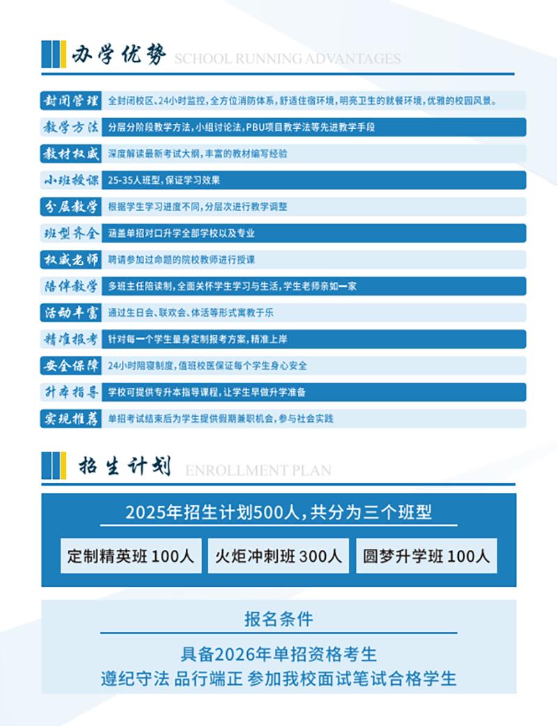 机构简介:沈阳市辽达单招培训学校,是一所拥有雄厚教育资源背景的培训学校,常年与多所高校均有合作往来,为高校以及社会输送大量合格人才。本校拥有权威的指导团队、强大的师资力量、先进的教学方法、专业的管理机制、优良的教学环境,始终秉承“为学生负责、替家长分忧”的办学宗旨,以低进高出、培育英才为目标,多年来扎根教育领域,帮助万余家庭制定精准的升学方案,帮助学子圆梦理想大学。2025年辽达教育沈阳皇姑单招基地建设成立。单招基地占地面积8000余平,投资2000余万元。拥有综合教学楼一座、寝室楼一栋、室外操场一处、一体化食堂一座,在职员工200余人,可同时满足800人在校学习生活。