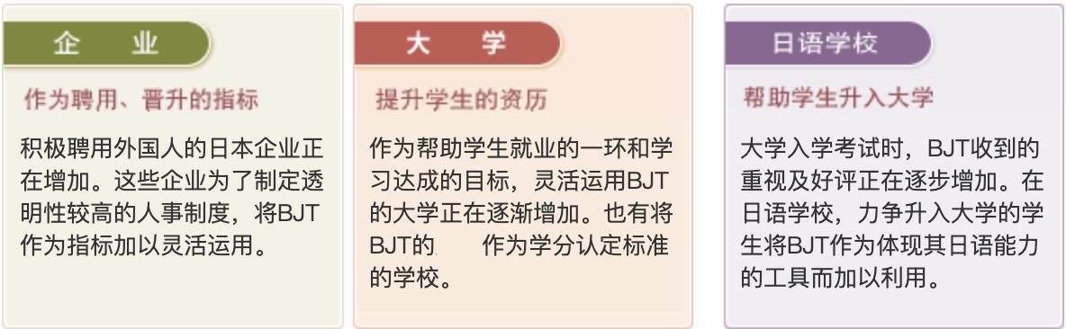 BJT是以具有语法、词汇、汉字等的知识为前提,针对是否能灵活运用这些知识,对所面临的信息进行适当处理这一交流能力进行客观测试的考试。因此,需要运用日语的所有商务场合均为考试范围。