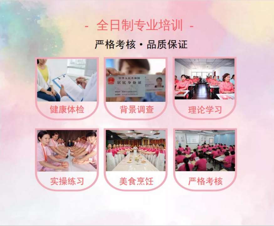培训项目包含:高级月嫂、高级育婴师、养老护理师(护工陪护)、产后康复师、催乳师、早教师、家政师以及小儿推拿师。