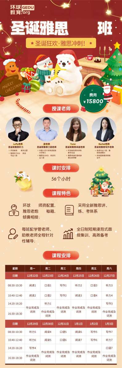 机构简介:环球雅思培训中心(简称:环球教育),20多年来,秉持教育成就未来的理念,专注于为中国学子提供优质的出国语言培训及配套服务。目前,环球教育已构建了包含语言培训、出国咨询、国际课程、游学考察、在线课程等在内的教育生态圈。 环球教育自1997年成立以来,一直勇于突破,乐于革新。2011年,环球教育与培生集团(Pearson)携手,推动了环球教育在教学研究、技术创新和国际化管理方面的长足进步。2017年,环球教育成为朴新教育科技集团的一员,为环球教育更快、更全面的成长奠定了坚实的基础。 环球教育以卓越的教学成效和良好的服务口碑在业界享有盛名,我们坚持以学生为中心,一手抓教学服务,一手抓师资力量。教学中应用科学的入学评测体系,实现学员的个性化学习;采用独特的"环球实用应试教学模式",关注学习进程,因材施教;"核心课 吸收课"的教学理念,帮助学生快速提升学习效能,达到出国学习的标准。同时,环球教育引进和培养了一批专业教学人才,通过科学的教师培训和管理体系,打造出一支实力雄厚、结构合理的师资团队,为优质教学提供坚强的保障。 我们以国际化教育集团的标准,促进产业创新,引领行业发展,大力推动中国教育事业的进步与发展。20多年来,环球教育不断壮大,旗下拥有300余家教学中心,遍布中国200多个城市,累计为六十余万名学员提供专业、多元的教育服务,为中国培养具有全球视野的国际化人才做出应有的贡献。