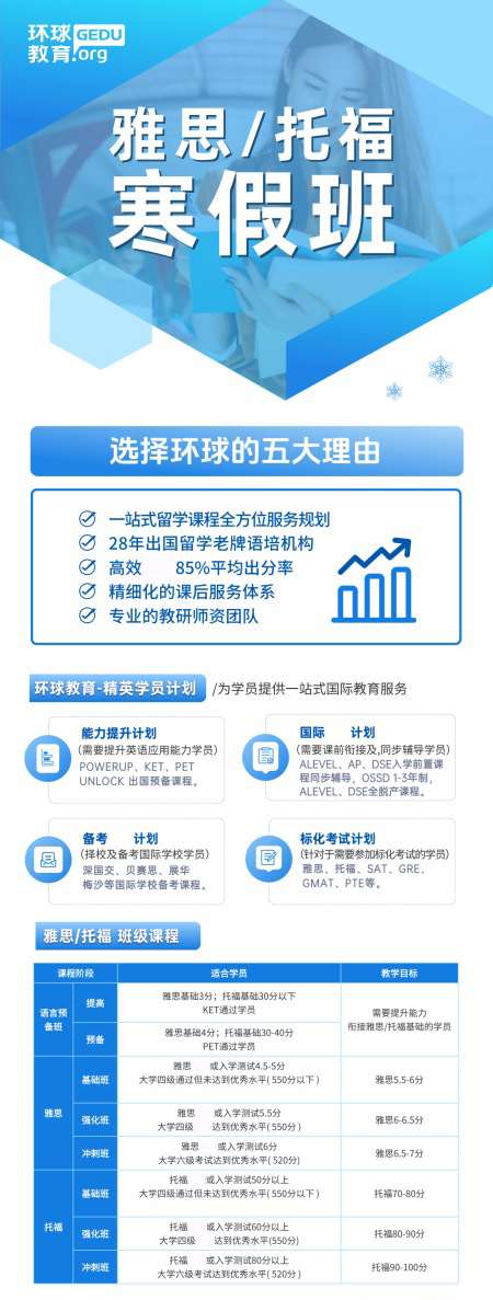 机构简介:环球雅思培训中心(简称:环球教育),20多年来,秉持教育成就未来的理念,专注于为中国学子提供优质的出国语言培训及配套服务。目前,环球教育已构建了包含语言培训、出国咨询、国际课程、游学考察、在线课程等在内的教育生态圈。 环球教育自1997年成立以来,一直勇于突破,乐于革新。2011年,环球教育与培生集团(Pearson)携手,推动了环球教育在教学研究、技术创新和国际化管理方面的长足进步。2017年,环球教育成为朴新教育科技集团的一员,为环球教育更快、更全面的成长奠定了坚实的基础。 环球教育以卓越的教学成效和良好的服务口碑在业界享有盛名,我们坚持以学生为中心,一手抓教学服务,一手抓师资力量。教学中应用科学的入学评测体系,实现学员的个性化学习;采用独特的"环球实用应试教学模式",关注学习进程,因材施教;"核心课 吸收课"的教学理念,帮助学生快速提升学习效能,达到出国学习的标准。同时,环球教育引进和培养了一批专业教学人才,通过科学的教师培训和管理体系,打造出一支实力雄厚、结构合理的师资团队,为优质教学提供坚强的保障。 我们以国际化教育集团的标准,促进产业创新,引领行业发展,大力推动中国教育事业的进步与发展。20多年来,环球教育不断壮大,旗下拥有300余家教学中心,遍布中国200多个城市,累计为六十余万名学员提供专业、多元的教育服务,为中国培养具有全球视野的国际化人才做出应有的贡献。