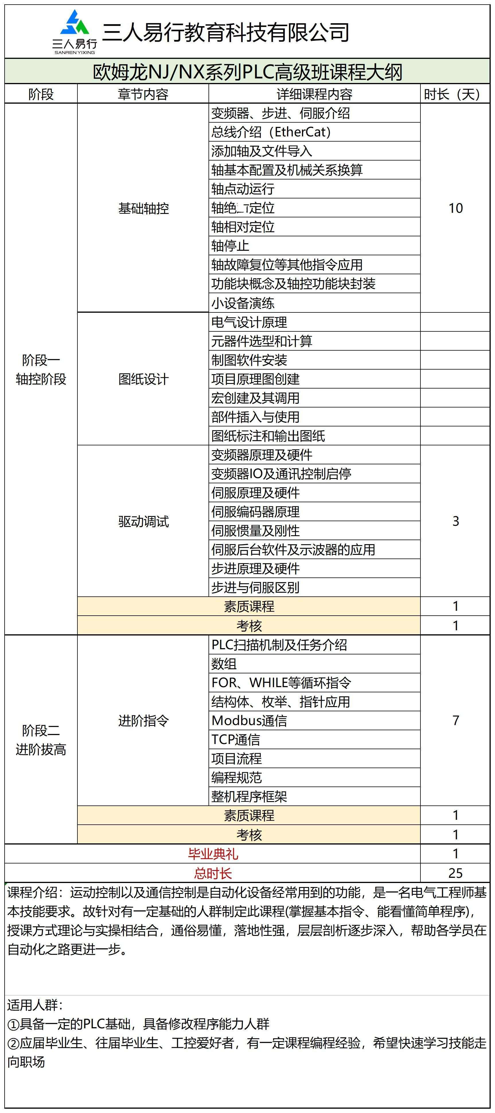 机构简介:深圳三人易行教育科技有限公司(以下简称“三人易行”)为广东三人易行科技有限公司旗下的子公司,授课导师拥有多个亿级自动化项目开发经验,总结行业独到经验,融合行业上市资源,针对学员1对1精心指导。高考冲刺式学习管理督导,白天授课+晚自习全天候学习覆盖,班主任全程督学,多品牌同步教学,让多维度知识融会贯通,实现高密度知识灌输。学校拥有80余位双师团队(工程师+讲师),核心团队90%成员毕业于985/211院校,老师均有大型项目、高校企业授课、社会面学员教学等多重经验,针对不同层级的学员因材施教。课程教学与当下企业需求直接接轨,将双师(工程师+讲师)经验融入课堂。课程教材、学习资料均由自三人易行智能智造学院(深圳三人易行教育科技有限公司下辖学校)自行研发,与上市公司实战需求同步更新,确保教材不过时,知识不过时,教学不过时。1对1职业生涯规划,跟进把控简历投递,让学员快速从小白身份转型成为企业职场精英。短短2个月时间,学员能在有限的时间习得综合性强、应用价值高的知识。从0基础到学会,再到行业初中高工,在千锤百炼的练习中,进阶之路自然畅通无阻。教学场地占地面积近10000平米,实训基地拥有价值上千万教学设备,吃住学一体化管理,可同时容纳学生300-500名。每台设备都由团队一手搭建。大到整个设备,小到一个触摸屏,都为学员量身定做,同时也充分贯彻理论与实践相结合的教学方针,实现理论教学、实验实践教学的有机统一。三人易行作为制造业技能人才解决方案服务商,通过联合中科院深圳研究所、国内各职业院校、高校,行业各标杆企业,共同打造制造业技能人才产业服务中心,为行业、企业培养与输送高端技能型人才。三人易行聚焦先进制造业,依托深厚自动化和智能制造背景的科技研发与培训团队,在智造技术开发、职业教育与培训、人力资源服务、数字科技四大领域推动产教融合、培就融合和数实融合,为政府和院校、企业客户和技能人才提供有竞争力的解决方案、产品及服务。三人易行全力打造制造业技术改造与技能人才产业链服务平台,致力于成为优秀的制造业技能人才解决方案服务商。学院环境:培训基地坐落在颐丰华创新产业园内,吃住学一体化,园区内餐饮近百家,羽毛球馆、篮球场、体育设施健全,超市、药店、理发厅等一应俱全,做到吃住学一体化管理。吃住安排:我校为学员提供免费住宿,上下铺 6 人间,配套独立卫浴、空调和热水器等基础设施。课程福利:0元试听,免费提供住宿。