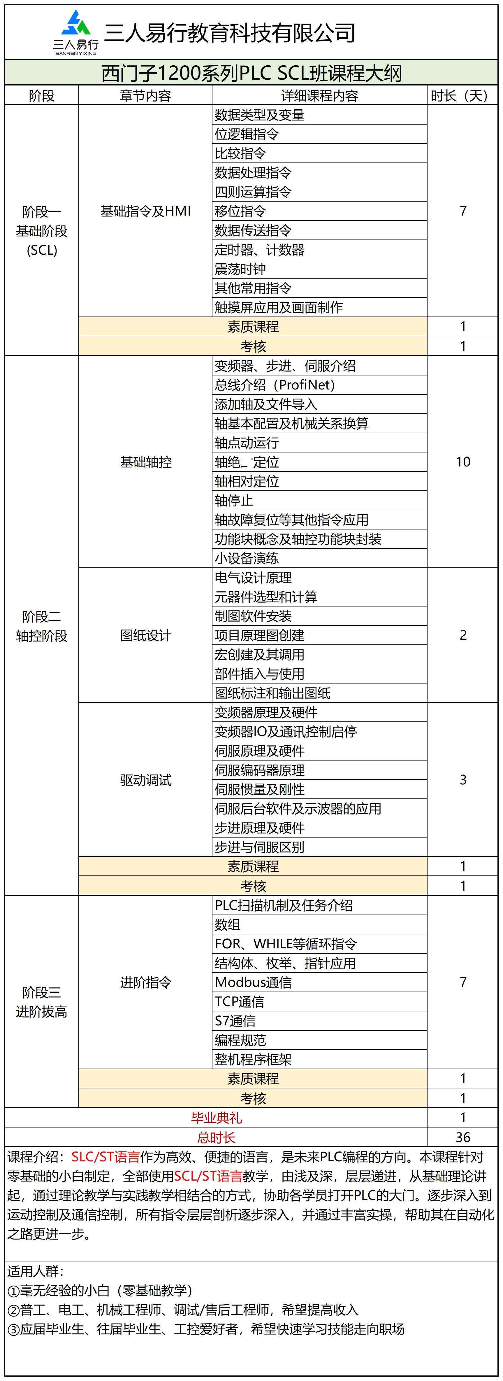 机构简介:深圳三人易行教育科技有限公司(以下简称“三人易行”)为广东三人易行科技有限公司旗下的子公司,授课导师拥有多个亿级自动化项目开发经验,总结行业独到经验,融合行业上市资源,针对学员1对1精心指导。高考冲刺式学习管理督导,白天授课+晚自习全天候学习覆盖,班主任全程督学,多品牌同步教学,让多维度知识融会贯通,实现高密度知识灌输。学校拥有80余位双师团队(工程师+讲师),核心团队90%成员毕业于985/211院校,老师均有大型项目、高校企业授课、社会面学员教学等多重经验,针对不同层级的学员因材施教。课程教学与当下企业需求直接接轨,将双师(工程师+讲师)经验融入课堂。课程教材、学习资料均由自三人易行智能智造学院(深圳三人易行教育科技有限公司下辖学校)自行研发,与上市公司实战需求同步更新,确保教材不过时,知识不过时,教学不过时。1对1职业生涯规划,跟进把控简历投递,让学员快速从小白身份转型成为企业职场精英。短短2个月时间,学员能在有限的时间习得综合性强、应用价值高的知识。从0基础到学会,再到行业初中高工,在千锤百炼的练习中,进阶之路自然畅通无阻。教学场地占地面积近10000平米,实训基地拥有价值上千万教学设备,吃住学一体化管理,可同时容纳学生300-500名。每台设备都由团队一手搭建。大到整个设备,小到一个触摸屏,都为学员量身定做,同时也充分贯彻理论与实践相结合的教学方针,实现理论教学、实验实践教学的有机统一。三人易行作为制造业技能人才解决方案服务商,通过联合中科院深圳研究所、国内各职业院校、高校,行业各标杆企业,共同打造制造业技能人才产业服务中心,为行业、企业培养与输送高端技能型人才。三人易行聚焦先进制造业,依托深厚自动化和智能制造背景的科技研发与培训团队,在智造技术开发、职业教育与培训、人力资源服务、数字科技四大领域推动产教融合、培就融合和数实融合,为政府和院校、企业客户和技能人才提供有竞争力的解决方案、产品及服务。三人易行全力打造制造业技术改造与技能人才产业链服务平台,致力于成为优秀的制造业技能人才解决方案服务商。学院环境:培训基地坐落在颐丰华创新产业园内,吃住学一体化,园区内餐饮近百家,羽毛球馆、篮球场、体育设施健全,超市、药店、理发厅等一应俱全,做到吃住学一体化管理。吃住安排:我校为学员提供免费住宿,上下铺 6 人间,配套独立卫浴、空调和热水器等基础设施。课程福利:0元试听,免费提供住宿。