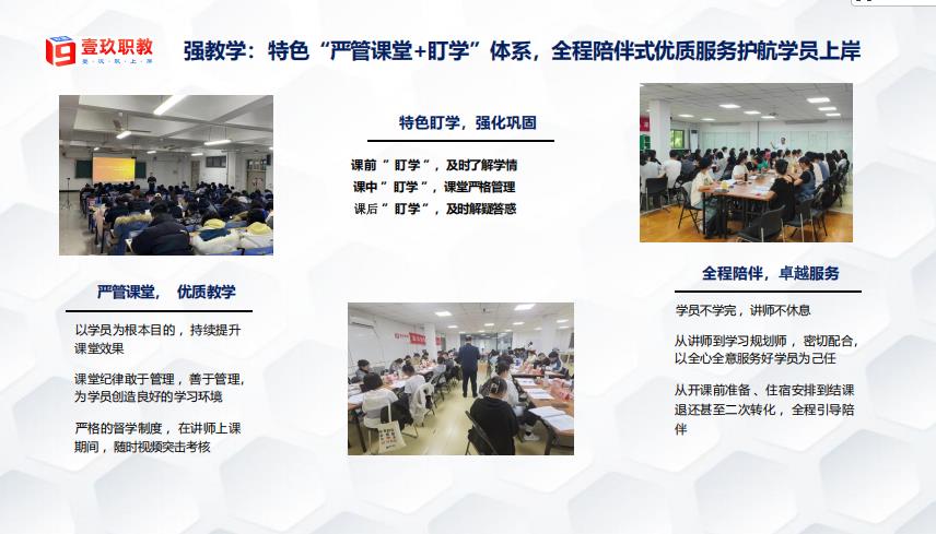 机构简介:壹玖职教成立于2022年1月9日,是一家专注公职教育的职业培训公司,业务涉及公务员、选调生、事业单位、军队文职、教师、三支一扶、国企、银行、烟草、社工等多个培训领域。“壹玖”含义为“专一、恒久”,自成立之初,壹玖就将“专心、专注、专业”作为企业成长和发展的核心价值观,依托团队成员在公职培训领域近十年的积累,结合当下职业培训领域发展趋势,走出了一条“线上线下结合、长期短期兼顾、分数素质齐飞”的特色培训路径,以优异的分数向关心、关注、信任壹玖的社会各界人士及莘莘学子交上了一份令人满意的答卷。自成立以来,壹玖呈现出高速发展态势,目前开通业务省份有河北,河南,山西,山东共拥有共有110家分校,固定教学场地超6000平米;拥有全职讲师近百余人,其中硕士及以上学历32人,平均从业时间四年以上;拥有顾问、分部合伙人、学习规划师、教务等200余人,成为公职类培训市场不容轻视的新生力量。壹玖高度重视自有师资队伍的培养以及建设:在石家庄、保定、郑州、济宁等地设立师资培训中心,持续开展师资培训;邀请国家、省级专业顾问对核心师资、备课组长开展讲座、讲学、集中培训;定期和不定期组织讲师集中教研、备课、赛课,并持续开展新进讲师培养,充实和提高师资队伍专业能力和业务水平,为保证教学质量、教学标准、提升学员分数提供了充足保障。壹玖重视教学方法和教学模式创新,持续推动教育教研升级,推出了:结构化申论、角度面试等一系列特色课程产品。其中《结构化申论》已获国家版权局版权保护,面试“菱形气球法”、“题干分析法”、“角度解答法”等独特的方法技巧。针对市场化培训“周期短、费用高、学员收获度不足”的传统痛点,壹玖采取“延长教学周期、线下授课与线上复听、先上岸后付费”等创新模式,为学员安心学习、提升分数打下了坚定基础。壹玖充分利用网络教育资源,补强传统教学短板。目前,所设置课程中,70%以上的笔试课程已采取“线上、线下同步教学”方式,学员在现场学习之余,还可通过线上平台回看当天课程回放,及时弥补不足之处、巩固重点难点。同时,该模式也为因工作、生活等其他原因不能到场的学员提供了身临其境的线上学习资源,使得传统教学的直观、互动性与线上教学的系统性、可重复性充分结合,提升了学习体验。壹玖重视教学书籍、资料的研发工作,已推出的精品图书产品包括:互动性申论理论教材《结构化申论》、《申论作文合集》、《申论参答字帖》;行测高分必备《行测WIN(万)题册》;面试特色教材《面面俱道》、面试口袋书《一“言”难尽》;公基必备高频考点手册《背多分》等公务员、事业编系列书籍,并每年进行 2-3 次修订再版,深受学员好评。壹玖职教愿同社会各界特别是教育界人士一起,以专业的水平、专注的态度,服务广大学子,促进高质量就业,培养新时代人才,为公职类教育发展贡献全部力量。壹玖——因为“专一”,所以“恒久”。