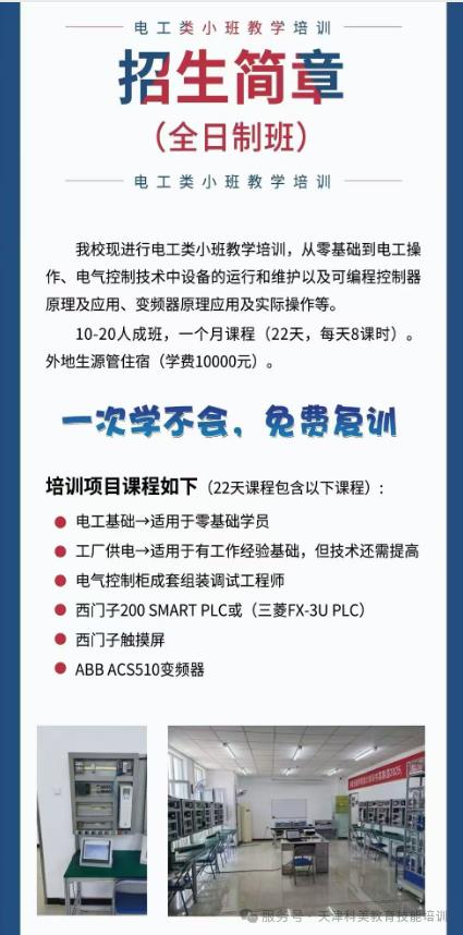1.一人一台机器,每个人都独立操作2.一次培训学不会,后续可以免费培训,直到学会为止3.小班教学每个班期不会超过十个人4.培训之后,有就业指导课。可以向上下游企业推荐工作。截至现在为止,培训过的学员想从事电气工作的的都从事了电气行业刚入门,(月薪4000到8000不等。根据技术实力而定。后续都有提升空间),截止到现在还没有找不到工作的