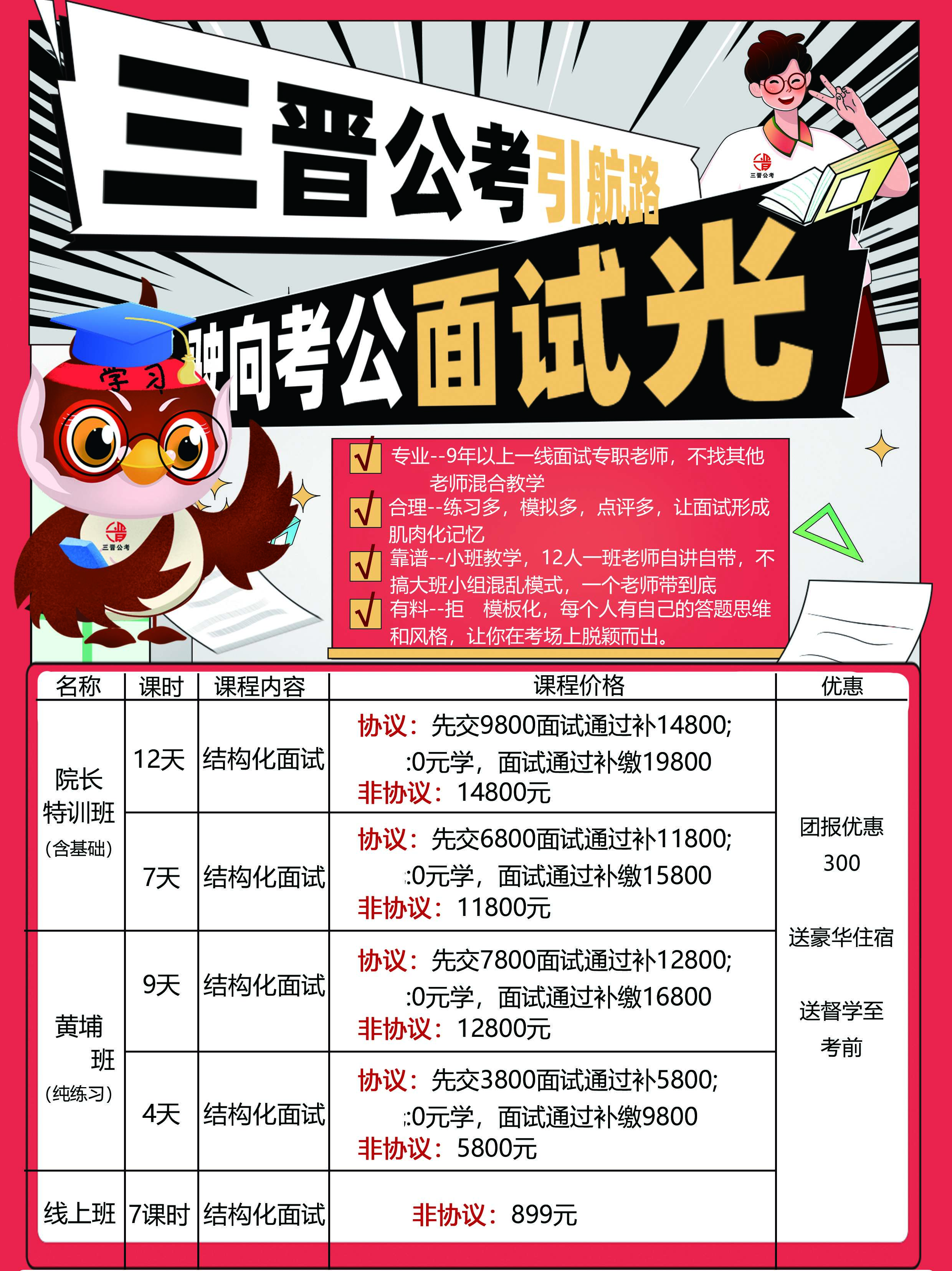 机构简介:关于三晋公考1、品牌介绍:“三晋”二字,是华夏文明的重要发源地,是黄河流域的千年烟火,更是每一位山西学子生于斯、长于斯的故土印记。三晋公考,便以这片土地为根,以“更适合山西本土学生”为信念,在公职考试的赛道上,做你懂乡音、知乡情的同行者。不同于全国性机构的“标准化模板”,三晋公考的每一步都深深扎根于山西考情的土壤。我们知道,山西学子或许更在意“离家近”的岗位选择,所以我们打造了“山西岗位数据库”,从省直机关到市县乡镇,从限制条件到竞争比分析,为你定制“人岗匹配指南”;我们更知道,备考路上你或许迷茫于“报岗犹豫”“面试紧张”,所以我们的顾问团队全是“山西土著”,用乡音陪你梳理思路,用对这片土地的热爱为你注入信心。公职考试,从来不是“考高分”的终点,而是“为山西发展贡献力量”的起点。三晋公考始终相信:适合山西学生的,不仅是考得上,更是考得对、走得稳。未来,三晋公考将继续扎根三晋大地,以更懂山西的教研、更贴本土的服务,助力每一位学子实现“公职梦”——不是简单的“上岸”,而是在山西的广袤土地上,用所学所知建设家乡,在基层一线书写属于山西青年的担当。因为我们深知:你为山西而战,我们为懂你而战。三晋公考,与你共赴山河,不负热爱。2、公司简介:三晋公考是一家立足山西本土,聚焦公务员、事业单位、银行国企、军队文职、社区工作者、辅警及各类公职考试培训,秉持“学员为上,服务为先”的办学理念,始终围绕“重师资,强研发,抓督学”到“看分数、强管理、重结果”的理念,我们以“本土化”为核心,构建“精准测评-深度学习-实战演练-科学报岗-贴心面试”全链路服务体系。致力于成为一家能够帮助学员科学、有效的提升学习分数,提供更换的学习体验,更适合山西本土学生的公考机构。企业文化1、理念(理念是行为基础):重师资,抓督学,强管理,重结果2、使命(使命是核心驱动力):学员为上,服务为先3、愿景(愿景是发展方向):致力于成为更适合山西本土学生的公考机构4、价值观(价值观是行动标尺):专业 认真 负责 创新师资介绍1、经验丰富(每位老师都有7年以上的教学经验,并且都有亲身经历各种考试的经验,他们不仅具备高度的责任感和使命感,而且把学生的分数提升当成首要任务,致力于提供优质的教学服务)2、高效教学(不论是零基础的小白,还是二战的同学,每一位老师都会因材施教,针对每位同学的不同学习效率进行辅导,始终坚持“能听懂,做的出,考得好”的教学理念)3、重视质量(重视教学的质量,每轮课结束后都会进行评估和复盘,不断优化教学过程,提高教学质量)