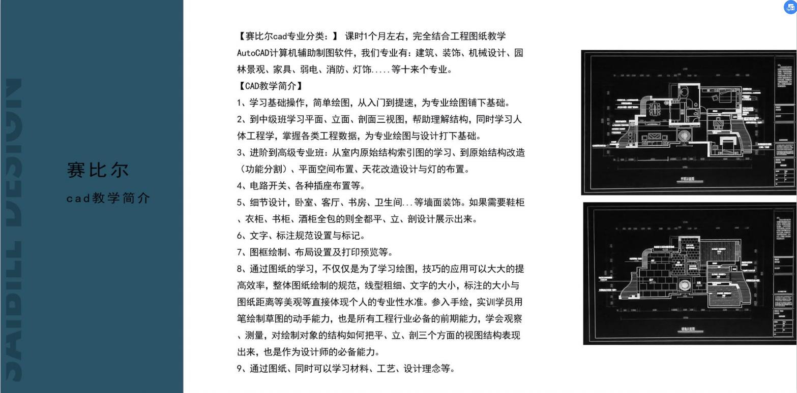 机构简介:本教育中心都是从教和工作多年的大学讲师授课,教学经验丰功卓越,也是高校内较经典和专业的平价培训,特色小班5人组教学模式+加强辅导过关,打破所有的传统的培训模式。资深设计师亲自授课,教学讲师都具有十多年的工作经验。先进的教学模式:理论与案例相结合,是从通过案例的教学和学习来掌握设计软件,不是学软件而学软件,如何结合设计要素在设计中应用。武汉赛比尔IT教育网是由省教委和劳动局审批,并由有权威的社会实践经验和教学经验的大专院校教师及社会优秀设计师的专业教师队伍授课和辅导的一家电脑培训机构。自九八年开设以来,本教育中心本着为民族教育事业为己任,以独特的、认真负责的教学方式和原则为社会输送大量的优秀人才和设计精英,并获得许多企业的赞许和社会殊评。本教育中心都是从教和工作多年的大学讲师授课,教学经验丰功卓越,也是高校内较经典和专业的平价培训,特色小班5人组教学模式+加强辅导过关,打破所有的传统的培训模式,从初级到高级一步到位,*优秀的推荐就业或实习。不鼓捣吹嘘,切切实实做到为学子们的IT教育服务。电脑已是现代高科技的象征,学习和掌握电脑不仅是为了我们自己,是为了我们民族的强大、国家的繁荣,金戈铁马、莺歌燕舞,更是为了广袤无垠、灿烂和神秘的宇宙学习而奋斗。【教学模式】:理论与案例相结合,是从通过案例的教学和学习来掌握设计软件,不是学软件而学软件,如何结合设计要素在设计中应用,引导学子们学习之余要多看多悟多练,多看--欣赏优秀的设计作品可以提高审美、悟—可丰富和提高的想象力和创作力;一人一机,温习、讲课、上机练习巩固加深三部曲。我们的纪律和制度是每天上课必须到,有事必须请假,每天上课的内容必须完成。