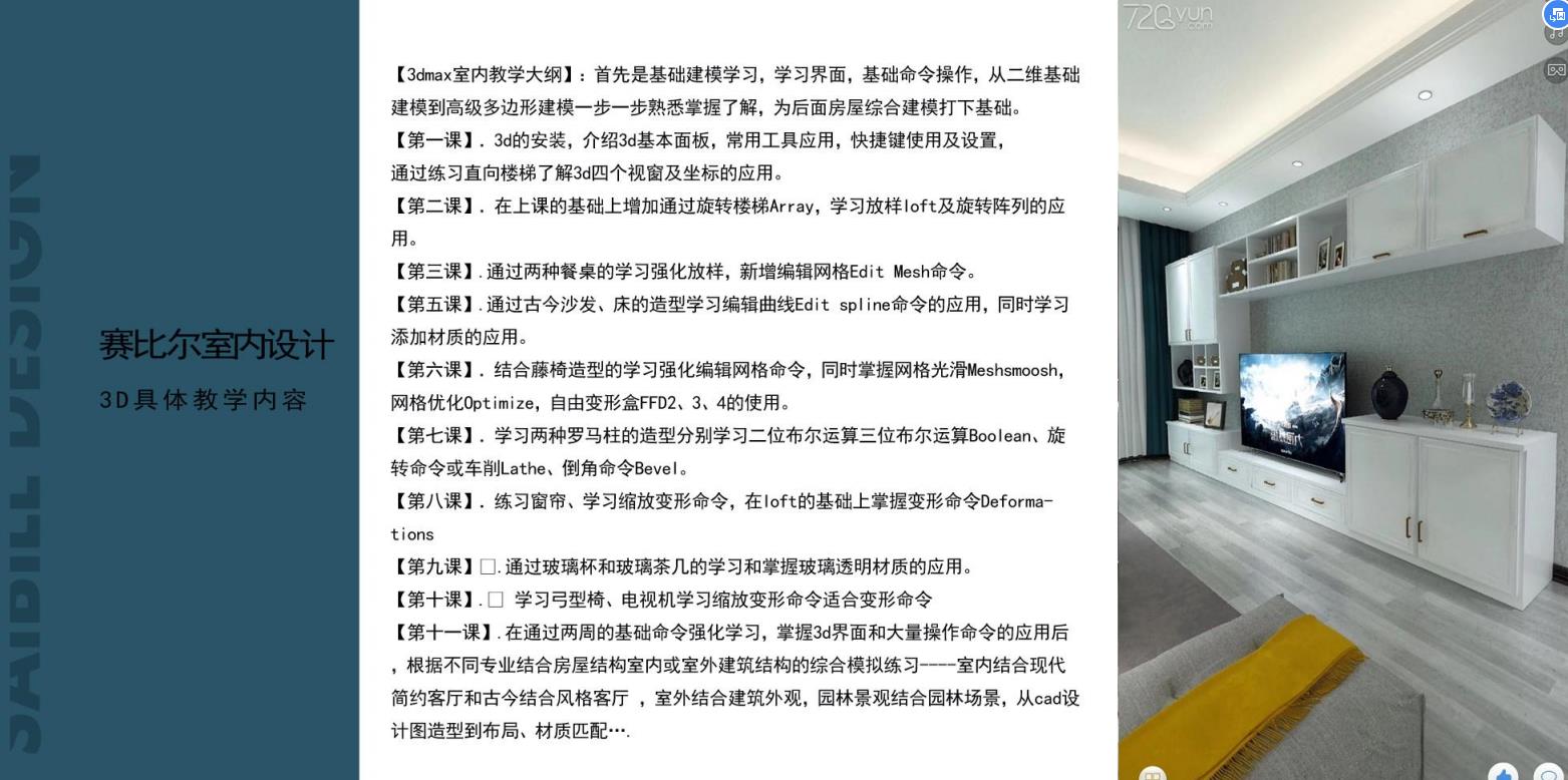 培训目标:全面系统地学习3ds Max、Vray、AutoCAD 、photoshop等软件综合运用制作专业室内效果图技术。案例涉及各种家装、工装、日景、夜景的表现,学习使用3ds Max灯光阵列技术、Vray渲染技术。从CAD识图、Vray导入模型渲染、PS后期合成修饰,掌握一整套专业的效果图制作流程,达到独立制作的行业要求。