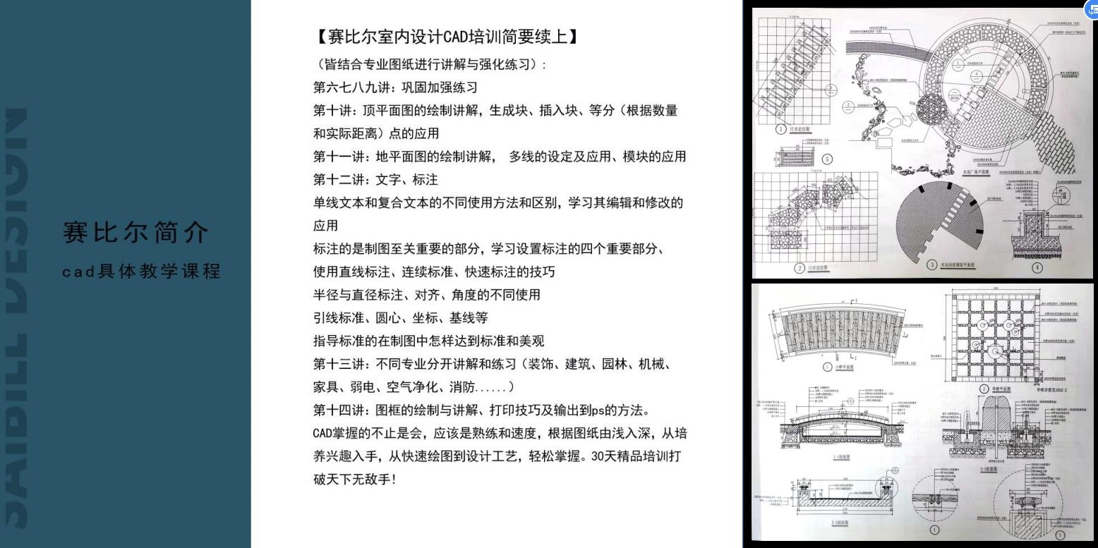 AutoCAD课程 :目标:熟练掌握Autocad软件的重要命令,能独立完成某空间的平面图、天花图、立面图、剖面图、大样图以及装框打印出图。