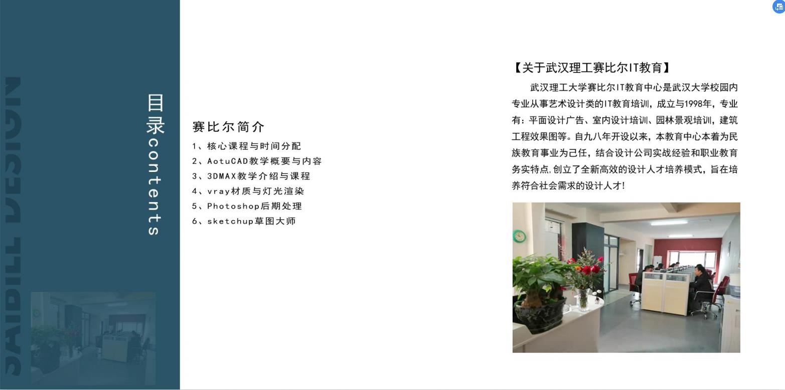 机构简介:本教育中心都是从教和工作多年的大学讲师授课,教学经验丰功卓越,也是高校内较经典和专业的平价培训,特色小班5人组教学模式+加强辅导过关,打破所有的传统的培训模式。资深设计师亲自授课,教学讲师都具有十多年的工作经验。先进的教学模式:理论与案例相结合,是从通过案例的教学和学习来掌握设计软件,不是学软件而学软件,如何结合设计要素在设计中应用。武汉赛比尔IT教育网是由省教委和劳动局审批,并由有权威的社会实践经验和教学经验的大专院校教师及社会优秀设计师的专业教师队伍授课和辅导的一家电脑培训机构。自九八年开设以来,本教育中心本着为民族教育事业为己任,以独特的、认真负责的教学方式和原则为社会输送大量的优秀人才和设计精英,并获得许多企业的赞许和社会殊评。本教育中心都是从教和工作多年的大学讲师授课,教学经验丰功卓越,也是高校内较经典和专业的平价培训,特色小班5人组教学模式+加强辅导过关,打破所有的传统的培训模式,从初级到高级一步到位,*优秀的推荐就业或实习。不鼓捣吹嘘,切切实实做到为学子们的IT教育服务。电脑已是现代高科技的象征,学习和掌握电脑不仅是为了我们自己,是为了我们民族的强大、国家的繁荣,金戈铁马、莺歌燕舞,更是为了广袤无垠、灿烂和神秘的宇宙学习而奋斗。【教学模式】:理论与案例相结合,是从通过案例的教学和学习来掌握设计软件,不是学软件而学软件,如何结合设计要素在设计中应用,引导学子们学习之余要多看多悟多练,多看--欣赏优秀的设计作品可以提高审美、悟—可丰富和提高的想象力和创作力;一人一机,温习、讲课、上机练习巩固加深三部曲。我们的纪律和制度是每天上课必须到,有事必须请假,每天上课的内容必须完成。