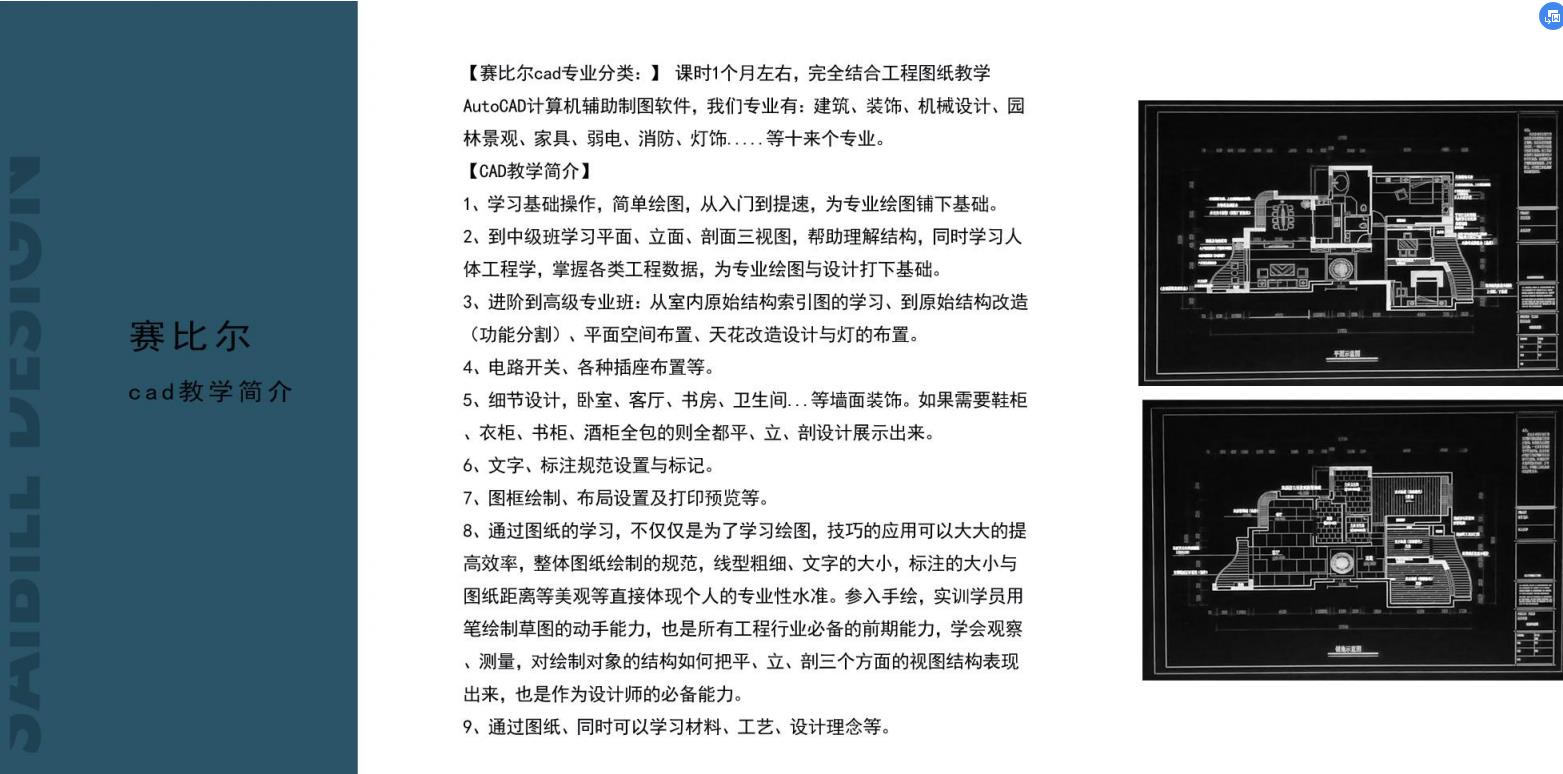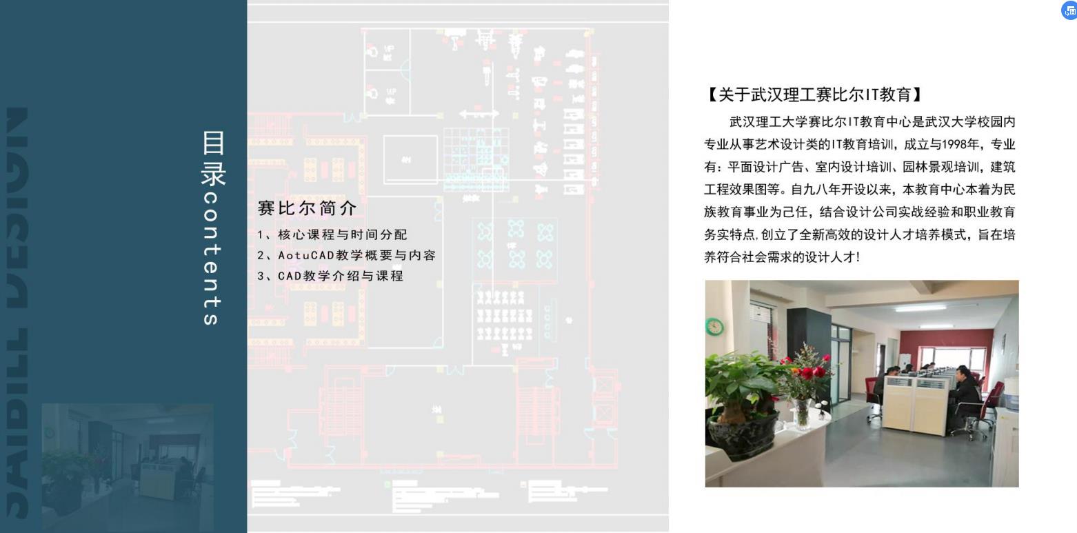 机构简介:本教育中心都是从教和工作多年的大学讲师授课,教学经验丰功卓越,也是高校内较经典和专业的平价培训,特色小班5人组教学模式+加强辅导过关,打破所有的传统的培训模式。资深设计师亲自授课,教学讲师都具有十多年的工作经验。先进的教学模式:理论与案例相结合,是从通过案例的教学和学习来掌握设计软件,不是学软件而学软件,如何结合设计要素在设计中应用。武汉赛比尔IT教育网是由省教委和劳动局审批,并由有权威的社会实践经验和教学经验的大专院校教师及社会优秀设计师的专业教师队伍授课和辅导的一家电脑培训机构。自九八年开设以来,本教育中心本着为民族教育事业为己任,以独特的、认真负责的教学方式和原则为社会输送大量的优秀人才和设计精英,并获得许多企业的赞许和社会殊评。本教育中心都是从教和工作多年的大学讲师授课,教学经验丰功卓越,也是高校内较经典和专业的平价培训,特色小班5人组教学模式+加强辅导过关,打破所有的传统的培训模式,从初级到高级一步到位,*优秀的推荐就业或实习。不鼓捣吹嘘,切切实实做到为学子们的IT教育服务。电脑已是现代高科技的象征,学习和掌握电脑不仅是为了我们自己,是为了我们民族的强大、国家的繁荣,金戈铁马、莺歌燕舞,更是为了广袤无垠、灿烂和神秘的宇宙学习而奋斗。【教学模式】:理论与案例相结合,是从通过案例的教学和学习来掌握设计软件,不是学软件而学软件,如何结合设计要素在设计中应用,引导学子们学习之余要多看多悟多练,多看--欣赏优秀的设计作品可以提高审美、悟—可丰富和提高的想象力和创作力;一人一机,温习、讲课、上机练习巩固加深三部曲。我们的纪律和制度是每天上课必须到,有事必须请假,每天上课的内容必须完成。