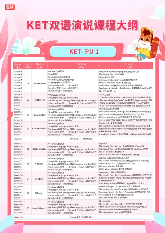 教学师资:高途ket教师均具备英语相关证书及多年行课经验,在英语专业上深耕多年,教学上注重语言学习特点,因材施教,更注重培养孩子语言学习能力和学习兴趣,为孩子的未来语言做好学习铺垫。