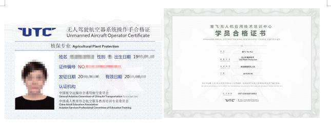 课程颁发由中国航空运输协会通用委员会认证的《UTC无人驾驶航空器系统操作手合格证》+慧飞颁发的《慧飞无人机应用技术培训中心学员合格证书》。