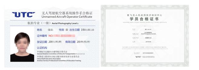课程颁发由中国航空运输协会通用委员会认证的《UTC无人驾驶航空器系统操作手合格证》+慧飞颁发的《慧飞无人机应用技术培训中心学员合格证书》。
