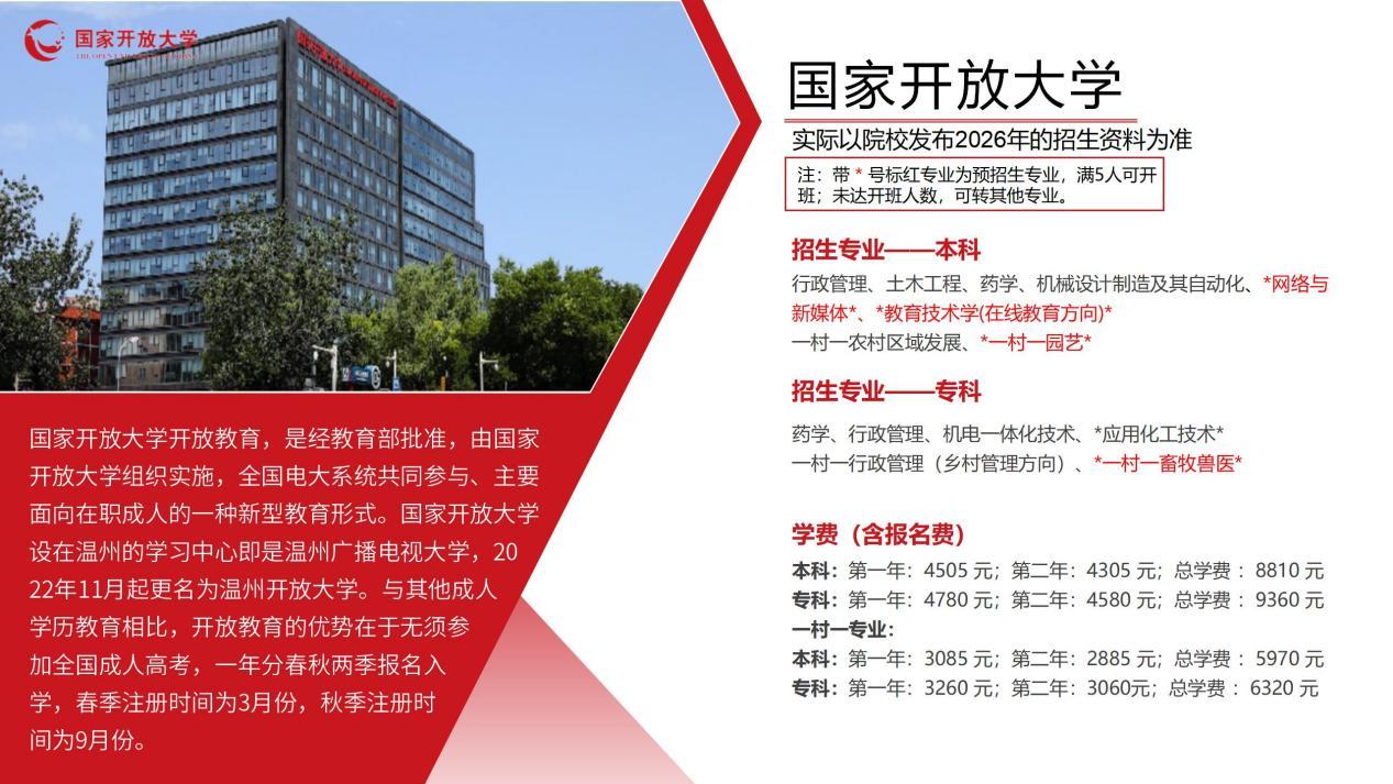 国家开放大学开放教育,是经教育部批准,由国家开放大学组织实施,全国电大系统共同参与、主要面向在职成人的一种新型教育形式。国家开放大学设在温州的学习中心即是温州广播电视大学,2022年11月起更名为温州开放大学。与其他成人学历教育相比,开放教育的优势在于无须参加全国成人高考,一年分春秋两季报名入学,春季注册时间为3月份,秋季注册时间为9月份。