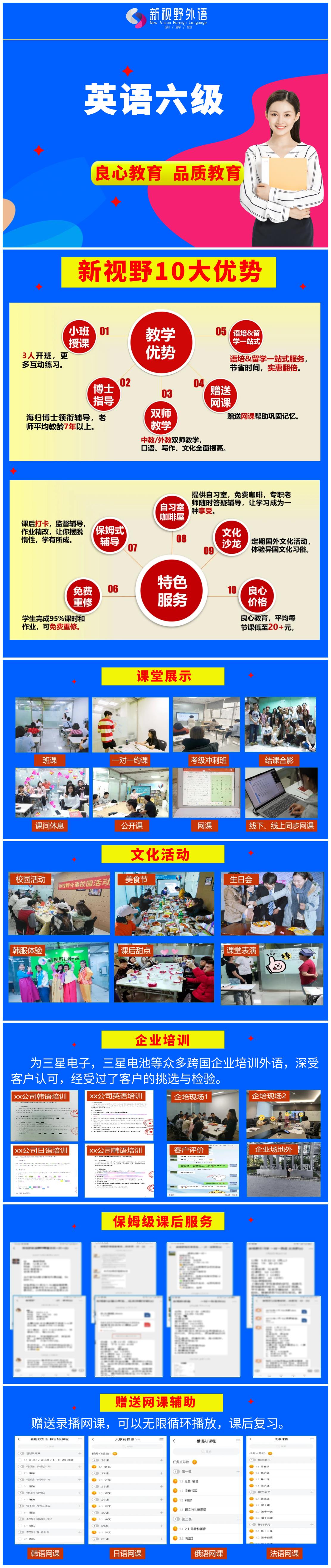 机构简介:新视野外语成立于2015年,是西安市专业的语言培训机构,已发展为雅思、托福、日语、韩语、俄语、德语、法语、西班牙语、意大利语、葡萄牙语、泰语、国际课程等多语言培训中心和留学服务机构,至今已培养3000多名外语专业学员。学校师资力量雄厚,博士领衔指导授课,老师均是留学海归或硕士研究生,教学经验丰富,治学严谨,小班授课,全程跟班,课后在机构自习,并有专业外教加强口语、写作以及文化课训练。多年来从我校出去的学生90%以上都通过等级考试,学校定期举办免费文化课、外教沙龙,使学生感受国外文化和乐趣。学校也和多家企业合作,为三星电子,奈佳罗软件、韩阳电子等企业培训英语、日语、韩语、俄语等,受到企业学员高度认可,长期签约。学校秉承“坦诚待人,真诚做人,虔诚育人”的理念,做真正的品质教育,良心教育。同时我们为学员提供一站式留学服务申请,挖掘学生优势,提供精确的校园信息和高质量的申请文书、套磁、面试辅导、签证等,帮助学生冲击高校,价格亲民,做真正的良心教育。选择新视野的10大理由教学优势:1、小班授课:3人开班,每节课均有互动,更多口语听力练习。2、博士辅导:海归博士领衔指导,老师平均教龄7年以上。3、赠送网课:课后网课帮助巩固记忆。4、双师教学:中教/外教双师教学,口语、写作、文化全面提高。5、语培&留学一站式服务:节省时间,实惠翻倍。服务特色:6、辅导班+读书屋+咖啡厅的结合体:提供自习室,免费咖啡,专职老师随时答疑辅导,让学习成为一种享受。7、保姆式服务:课后打卡,监督辅导,作业精改,让你摆脱惰性,学有所成。8、免费重修:学生完成95%课时和作业,未达到教学目标,可以免费重修。9、文化沙龙:定期举行文化活动,体验国外文化习俗,提前适应国外生活。10、价格亲民:良心教育,价格实惠,性价比超好。新视野留学申请特色1、资深顾问,专业服务:申请团队由海归博士、硕士团队及海外高校导师共同组成,提供一手院校信息和内部审核经验。2、定制文案,背景提升:采用三维评估体系,给每个学生从学术背景、个性特质、职业潜能三方面定制方案,挖掘学生独特的故事和亮点,做到一人一案,杜绝模块化方案,批量式生产。3、与学校深度合作,提高申请成功概率:我们与海内外多所院校保持紧密合作,可以直接内推,大大提高申请成功概率。4、“语培+留学”一站式服务:语培、留学深度协同,无缝衔接,避免语言学习时间和留学申请节点脱节,规划更科学。5、 精准的背景提升规划:我们不堆砌无用的活动,只为您的目标专业量身打造提升计划。根据目标专业,规划相关的科研、实习、竞赛或公益活动,有效提升软实力。6、全程一对一专属服务:从签约到入学,一位资深顾问全程负责,学生随时知道进度到哪,拒绝流水线作业和频繁更换对接人。7、过程公开:所有服务过程实时可查,申请账号密码向学生公开,过程完全透明。8、价格透明:一份价格,全程服务,无任何隐藏收费,在合同明确列清所有服务项与费用,杜绝后期加价,践行“良心教育”。9、“保姆式”督导与精准进度管理:我们不仅是规划师,更是您的学习闹钟和进度管家, 针对拖延症学生,提供个性化的时间节点提醒、材料催办和心态疏导,确保计划严格执行。10、全程留学服务:我们不止做到“成功留学”,而是要做到“留学成功”,从语言学习,留学申请,签证辅导,行前指导、接机住宿,学业支持、学历认证等全程服务,真正解决您的后顾之忧。11、良心价格&免费申请:学生以低的费用享受好的服务,部分国家可以免费申请。12、申请过程中随时退,让学生没有后顾之忧。新视野留学申请流程