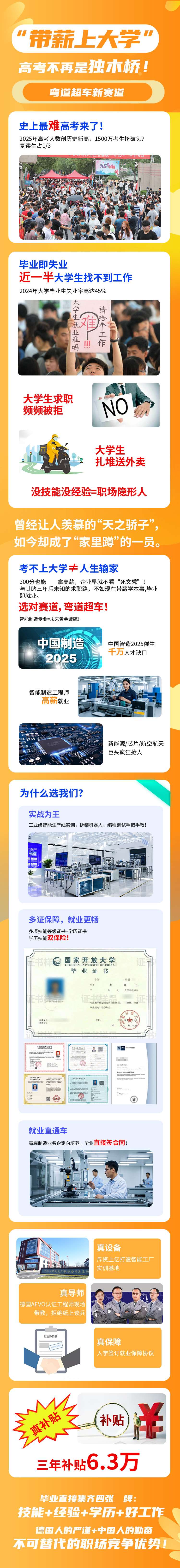 针对高中/中专或同等学历者,开设专科三年/本科五年的全日制学习课程。从基础的机械、电气安装与PLC编程入手,逐步深入到工业控制、网络通讯、运动控制等关键领域,进而涵盖工业机器人技术,最终聚焦于智能产线的综合调试,确保学员们全面掌握所需技能,成长为符合企业实际需求、具备扎实综合技能与复合知识结构的复合型人才。面对如今毕业即失业的风险,只有通过高强度的实操训练,融入职业岗位能力,增加就业的职场竞争力,才能真正的高质量就业。